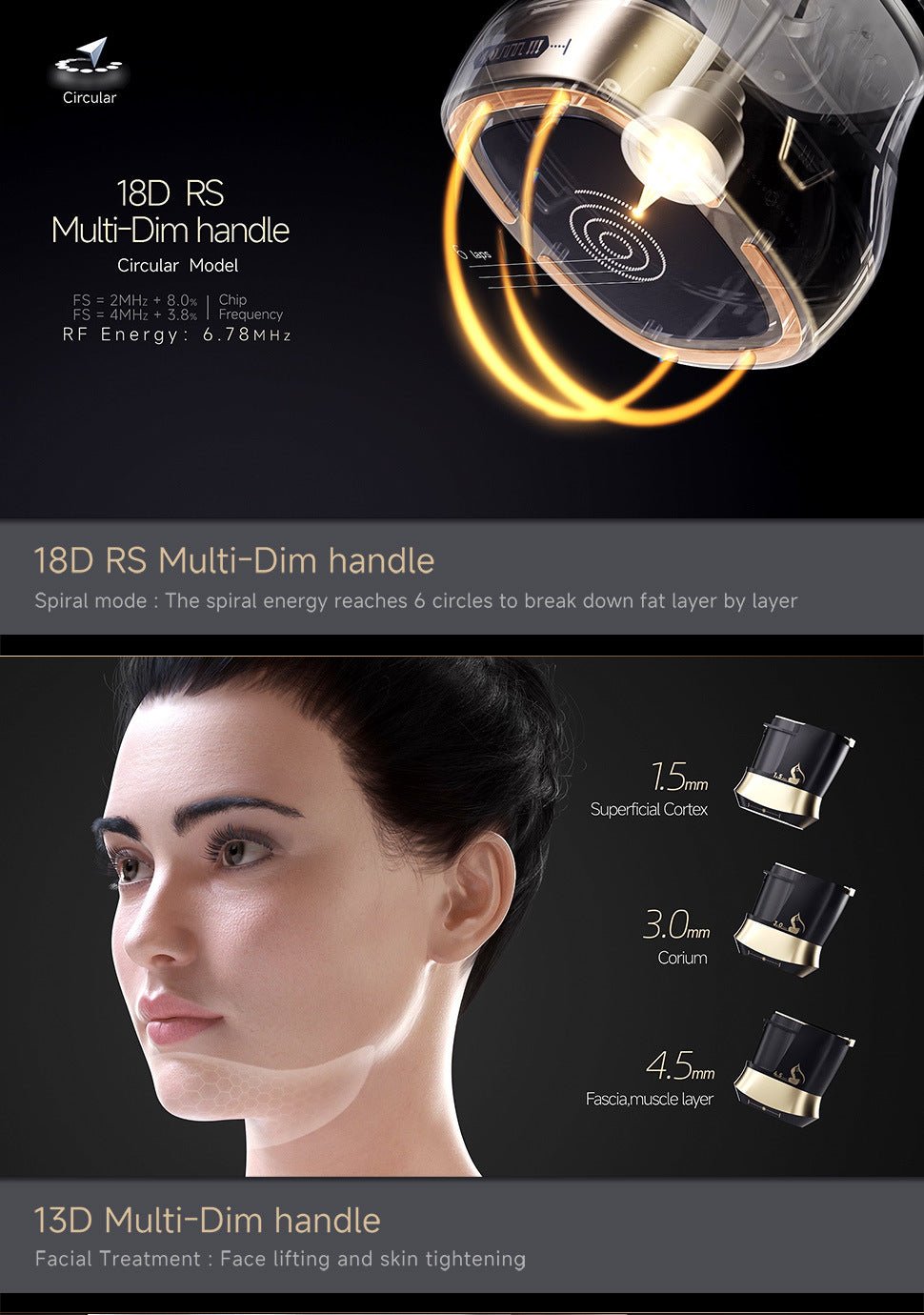• Delivers energy at various depths to support skin elasticity and body contouring using HIFU and Liposonix technology