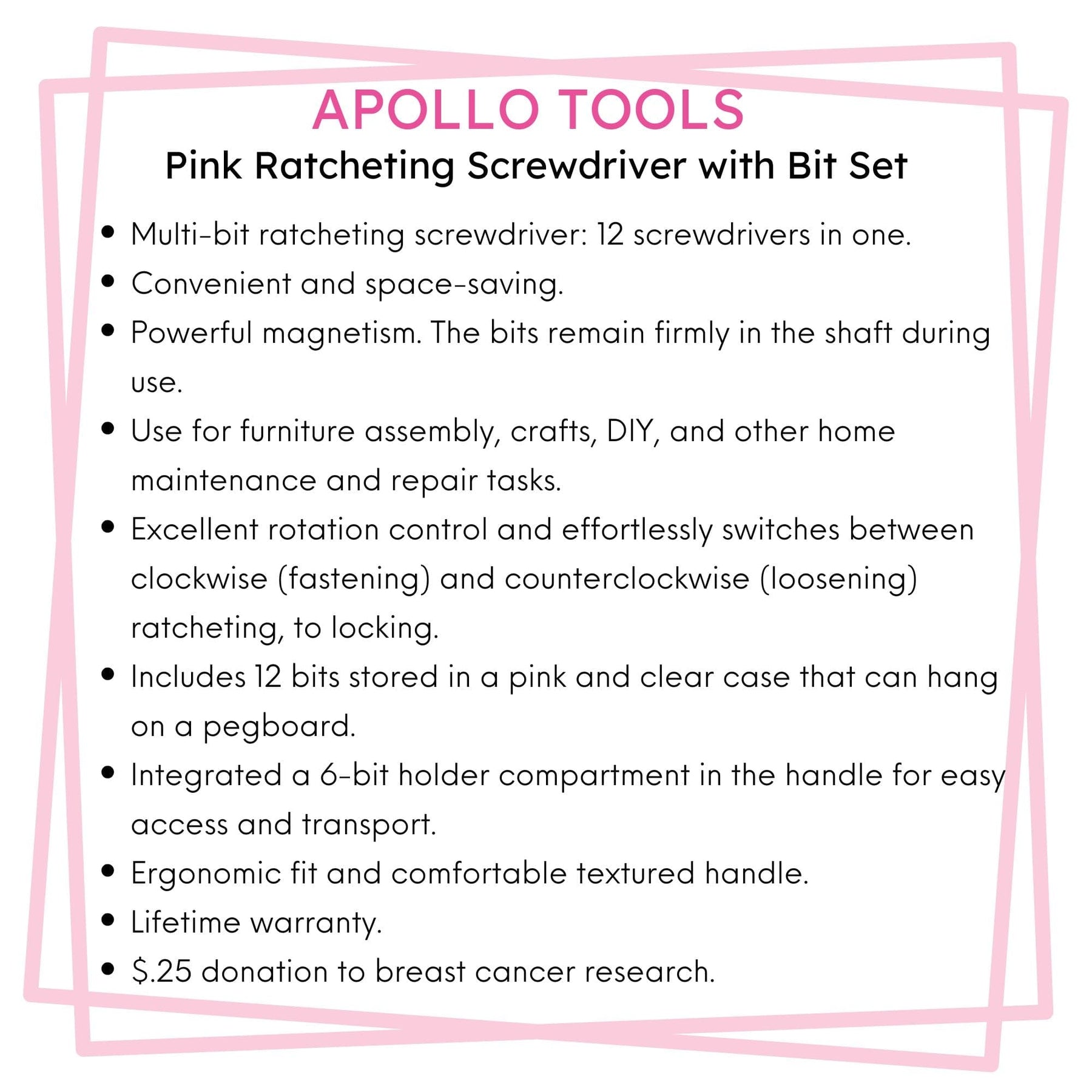 • 13-in-1 versatility — A compact ratcheting screwdriver that includes a set of 12 most-used bits in a pink and clear case, with a 6-bit holder built into the handle for quick access.