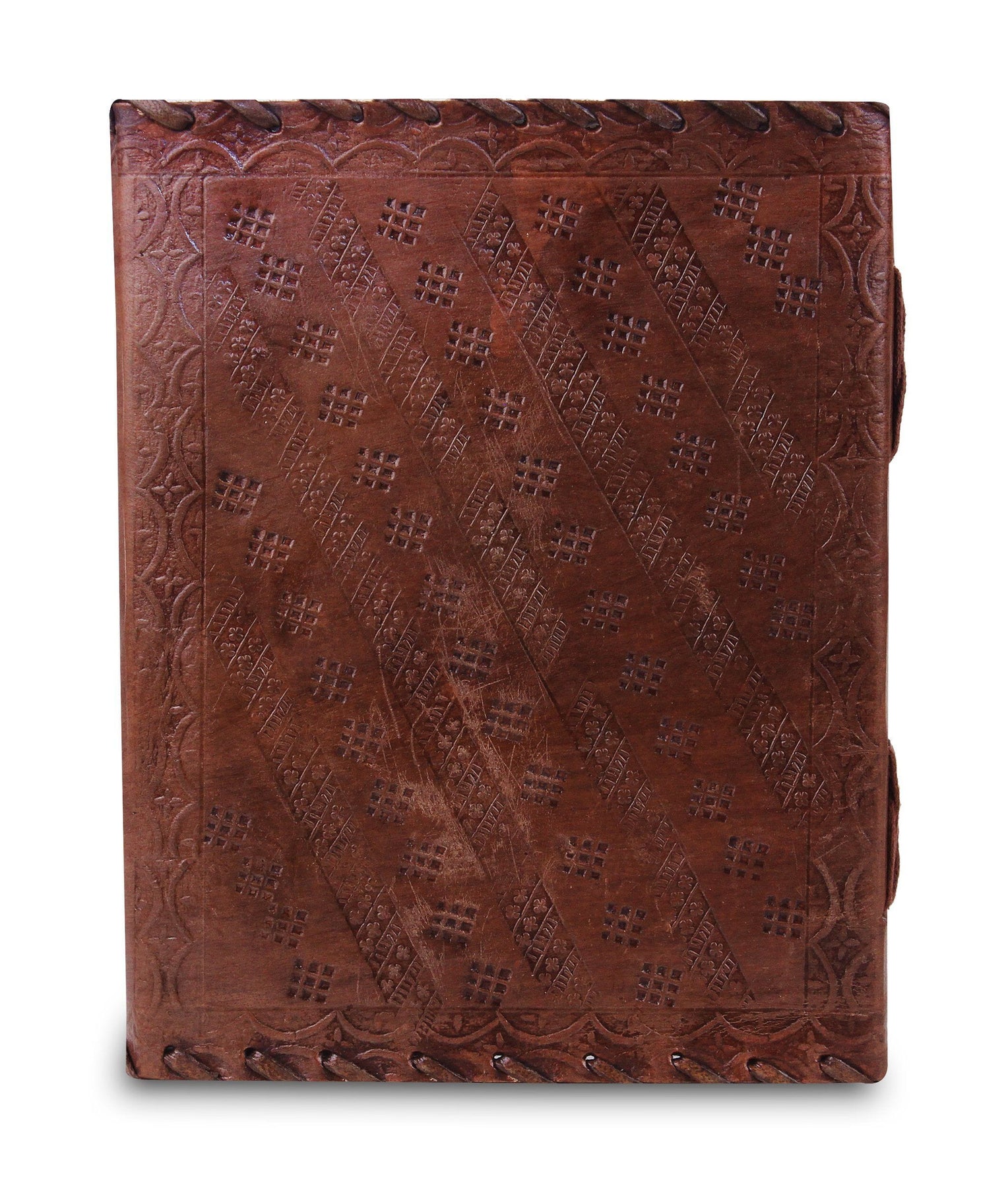 • Material: Made of full-grain goat leather with hand-embossed three eye stones on the cover, giving its distinctive vintage look.