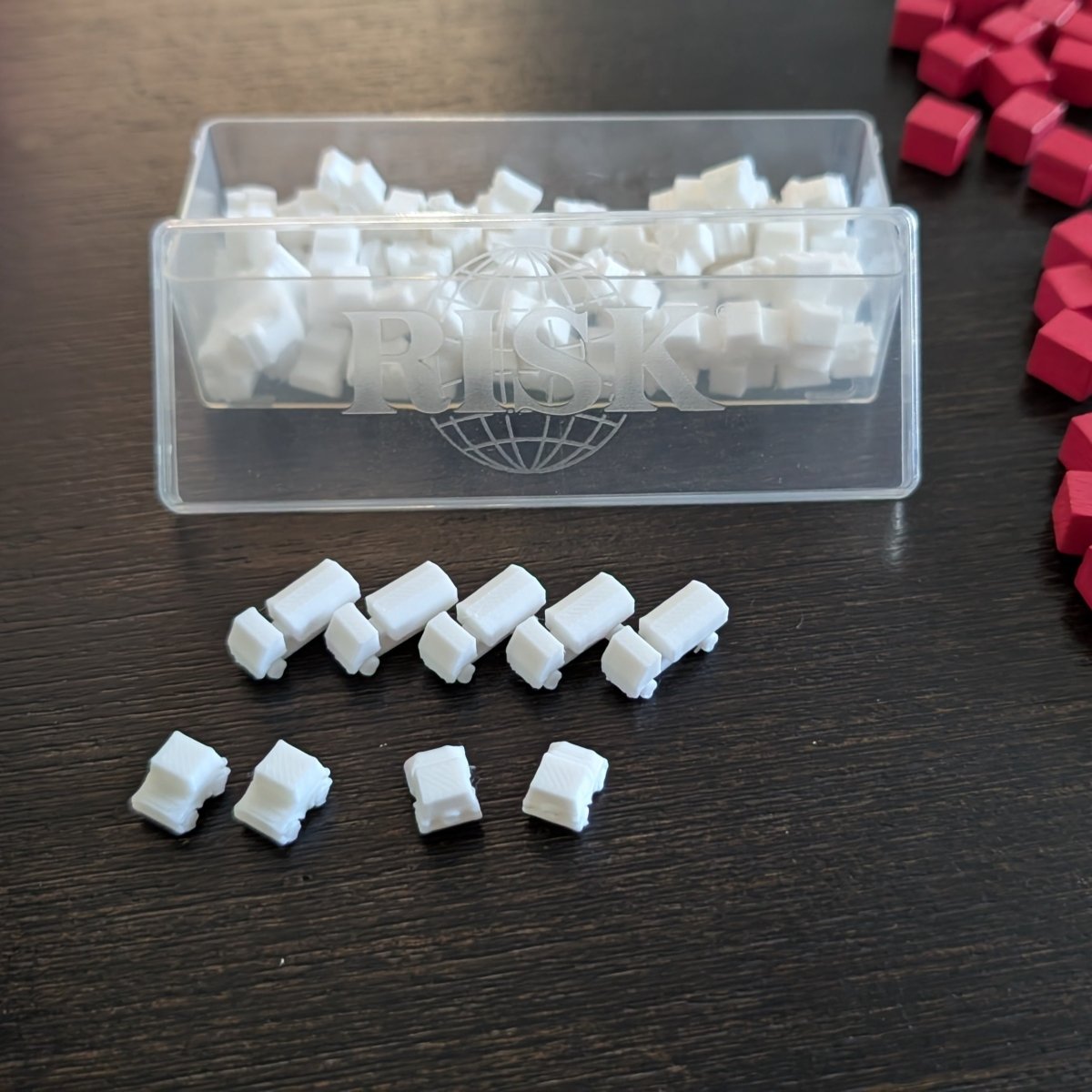 Upgrade your Risk battles with an 85-piece set of 3D printed army pawns, featuring jeep-style units and troop carriers in multiple colors for quick recognition on crowded battlefields.