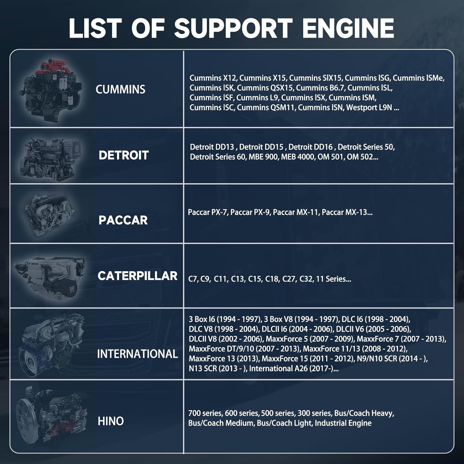 • Wide Vehicle Coverage Works with Freightliner, Cummins, Volvo, CAT, PACCAR, Isuzu, Hino, and more; Covers Class 4–8 trucks, buses, and off-highway equipment.