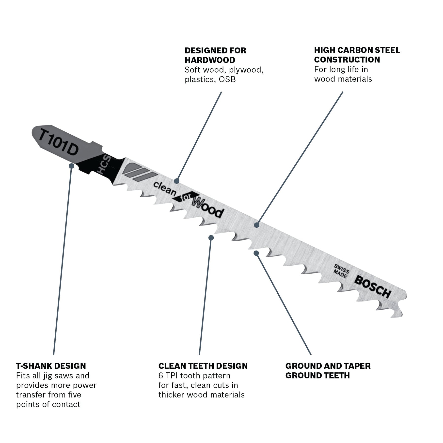 BOSCH T101D 5 pc. 4 In. 6 TPI Clean for Wood T-Shank Jig Saw Blades