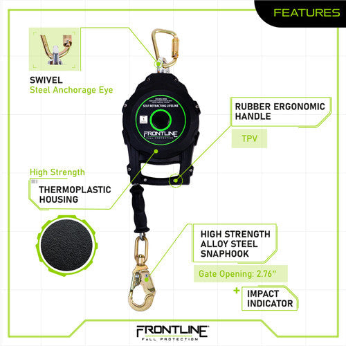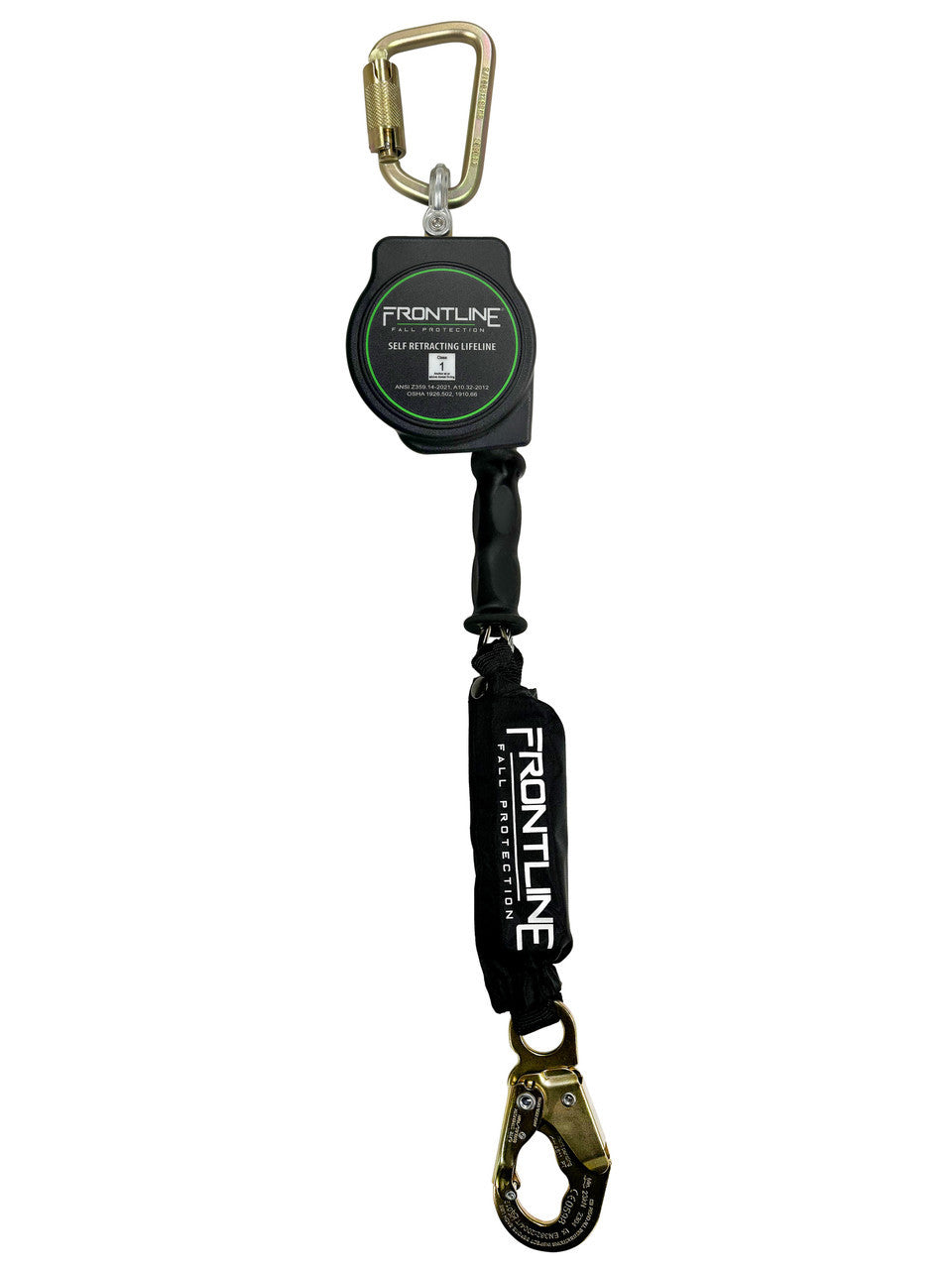 Meet the Frontline RPG10, a 10' cable single-leg self-retracting lifeline built for workers who value fast protection at height. This SRL engages quickly to limit fall distance and lessen impact, giving you peace of mind while you work—even when gravity decides to test you.