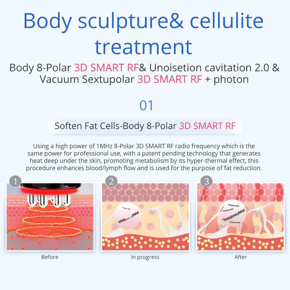 • 6-in-1 multifunction system combining Unoisetion Cavitation 2.0, Multipolar Photon RF Therapy, Vacuum RF Therapy, and LED laser technology for comprehensive body contouring and skin wellness.