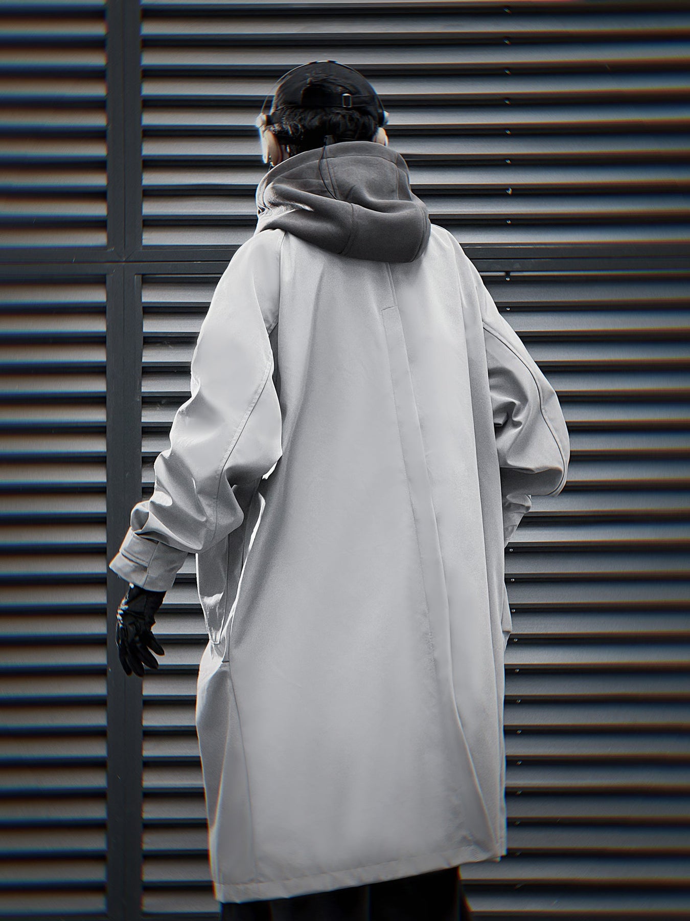 • Design fusion: pullover hoodie combined with an anorak trenchcoat for urban practicality and style.