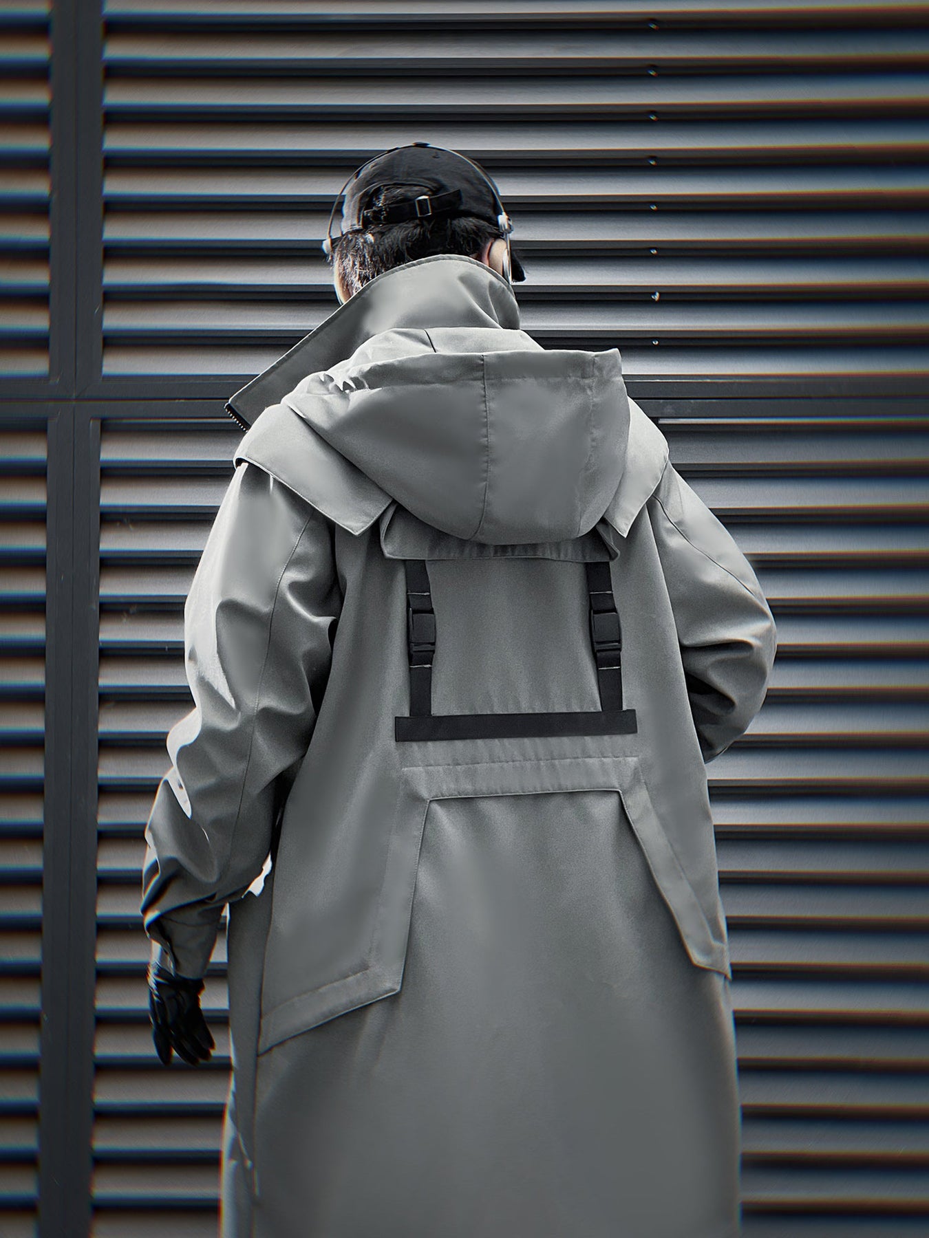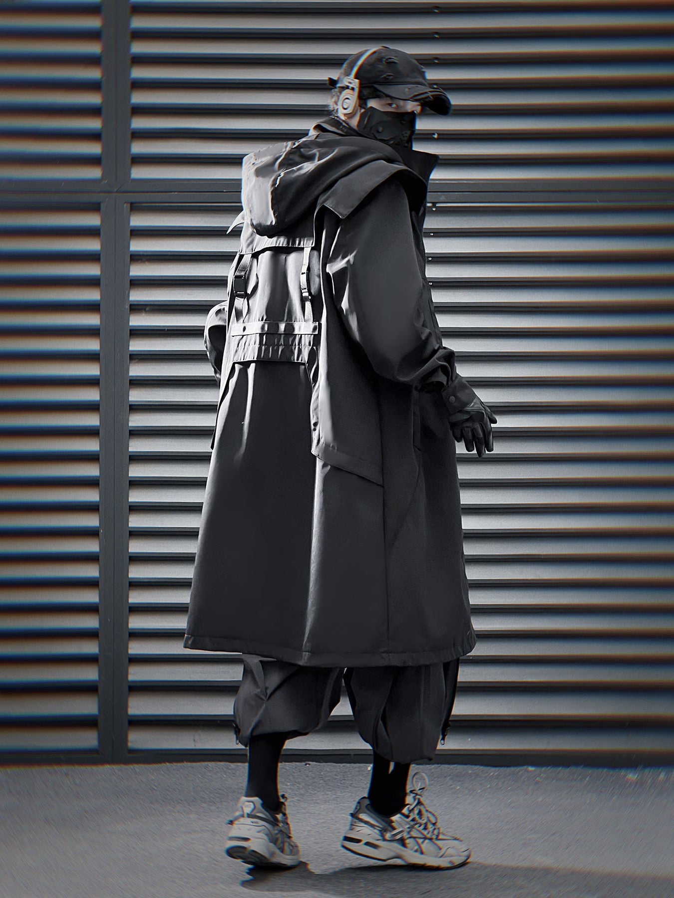 HiJ37 Urban Trench Coat blends a pullover hoodie with an anorak trench coat for city-ready warmth, edge, and versatility. Model is 5 feet 11 inches or 180 cm and is 167 lbs or 75.7 kg and is wearing size L for oversized look and M for regular fit.