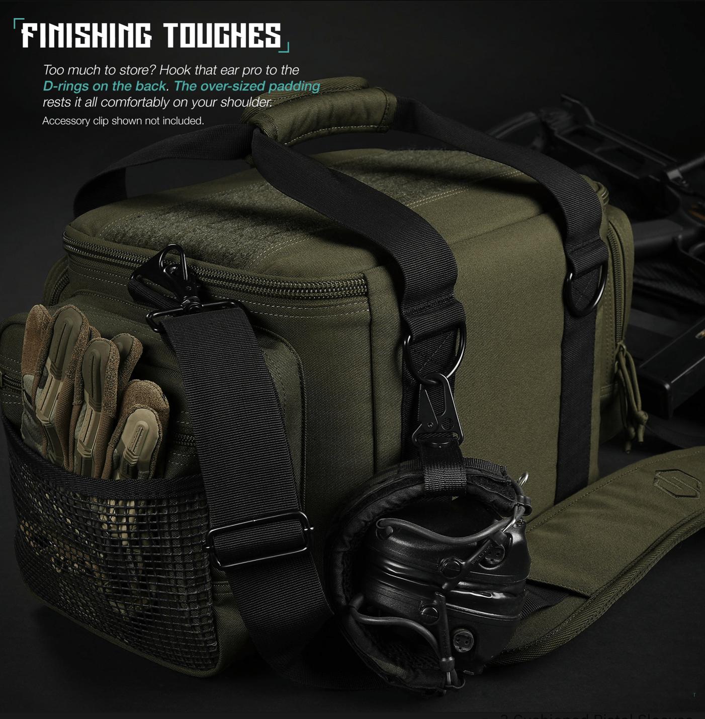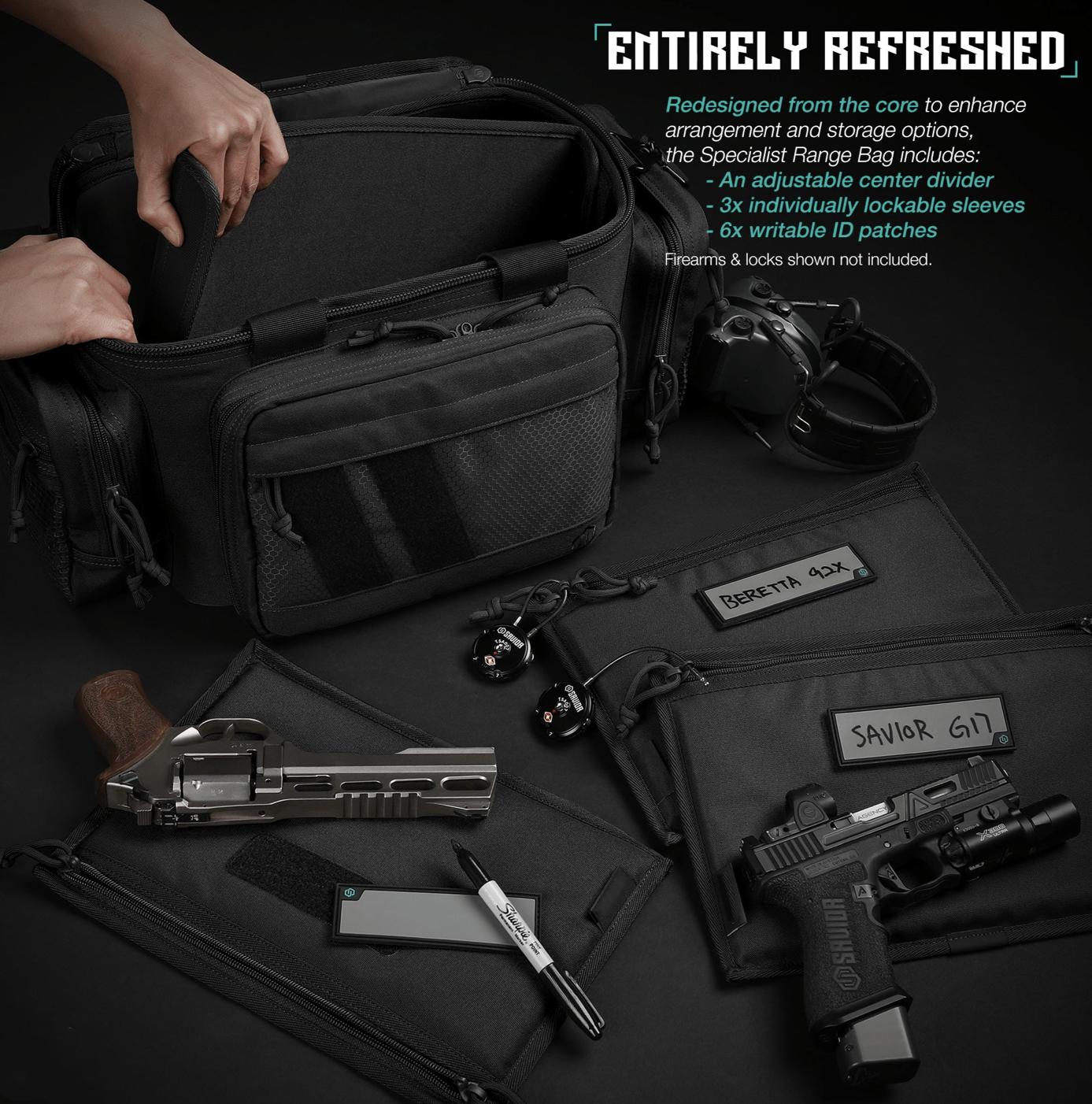 • Built Tough: Made for duty use, the Specialist Range Bag’s double-stitched seams, durable materials, and compressed EVA frame withstand demanding environments. An oversized padded shoulder strap and sturdy carry handles provide comfortable, hands-free transport to and from the range, while writable ID patches help quickly identify your bag in busy environments.