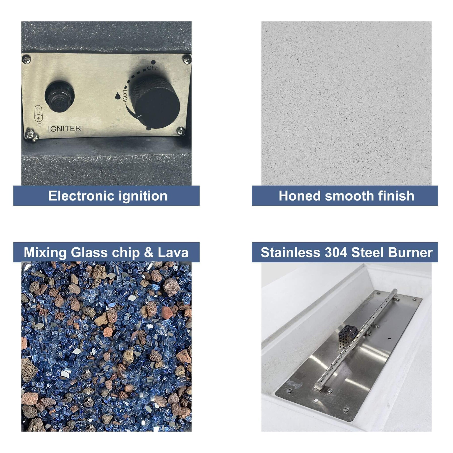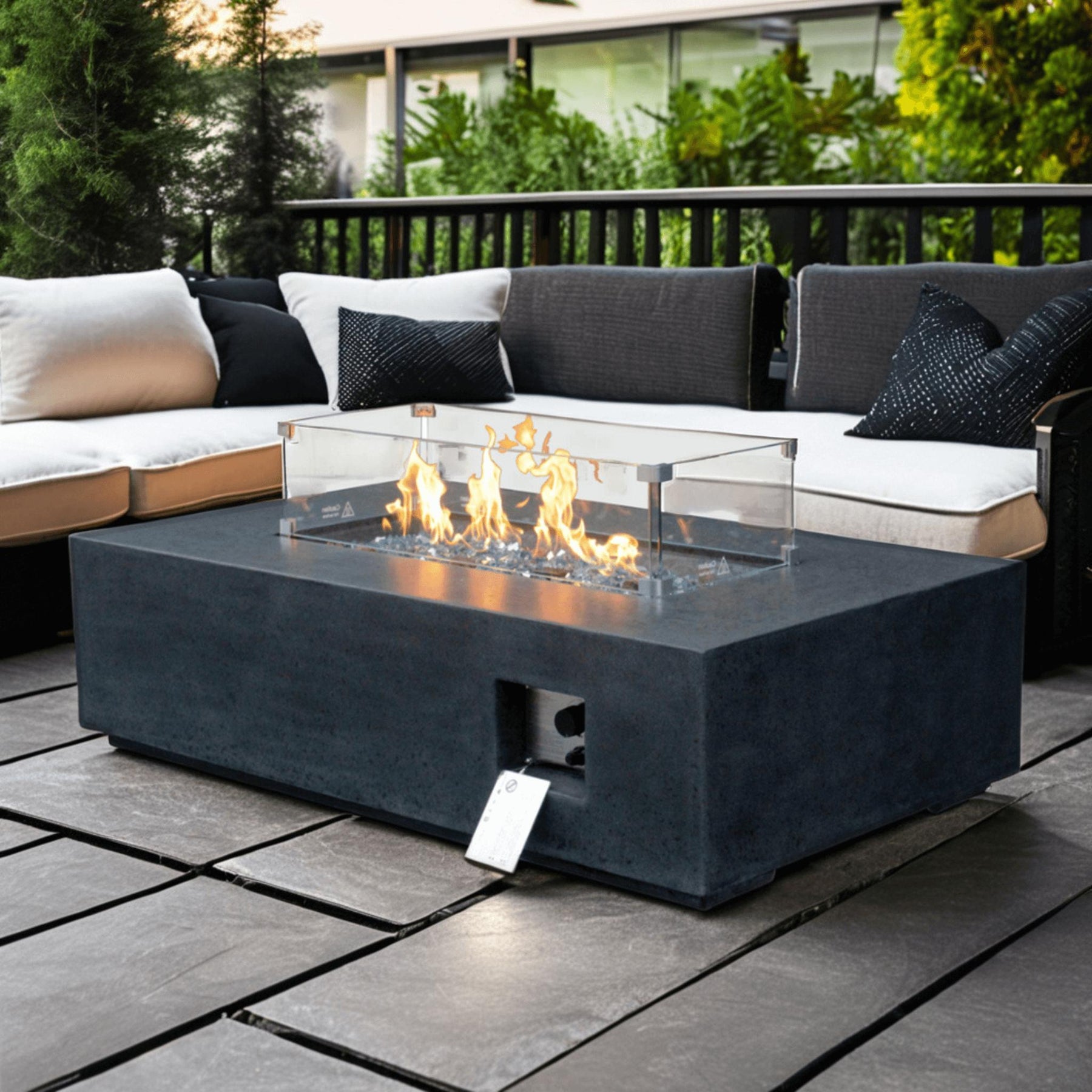 • Design: Rectangular fire pit table with a minimalist concrete finish that complements any outdoor decor.