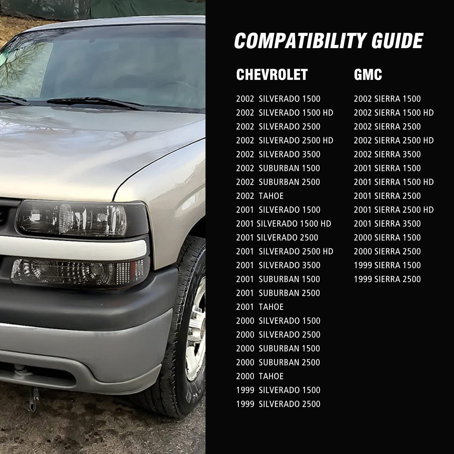 • BRIGHT HEADLights Compatible with: Chevrolet Silverado 1500 / 2500.01-02 Chevrolet Silverado 1500 HD / 2500 HD / 3500 HD.00-06 Chevrolet Suburban 1500 / 2500 / Tahoe.
