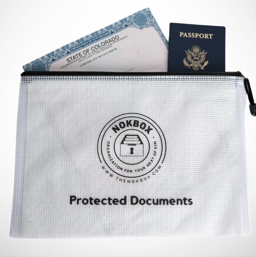 • 1 zippered Document Protector bag This bag is for items that belong in your safe or somewhere secure, like passports and birth certificates. The NOK will use this bag to collect other important items they need to keep secure while managing your estate.