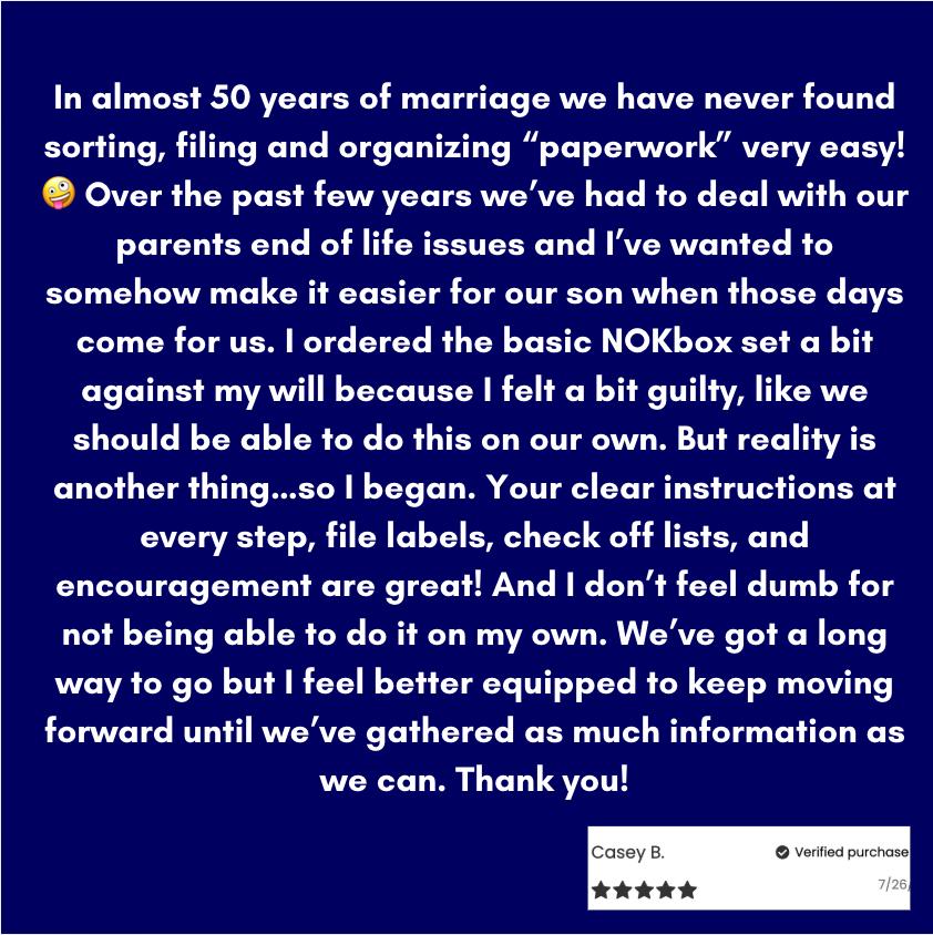 The Original Nokbox is a complete estate- and life-organization system designed to keep you and your NOK prepared, organized, and a little less chaotic. It’s your all-in-one solution for bridging the gap between what you store online and what stays tangible when it matters most.