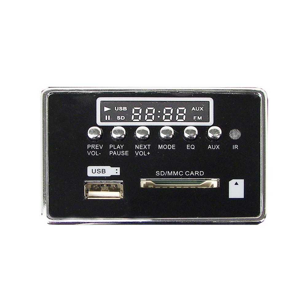 • Multiple playback options — Built-in USB input, SD card slot, and FM radio. Rear Aux Input connects wired external audio players; RCA inputs (cables included).