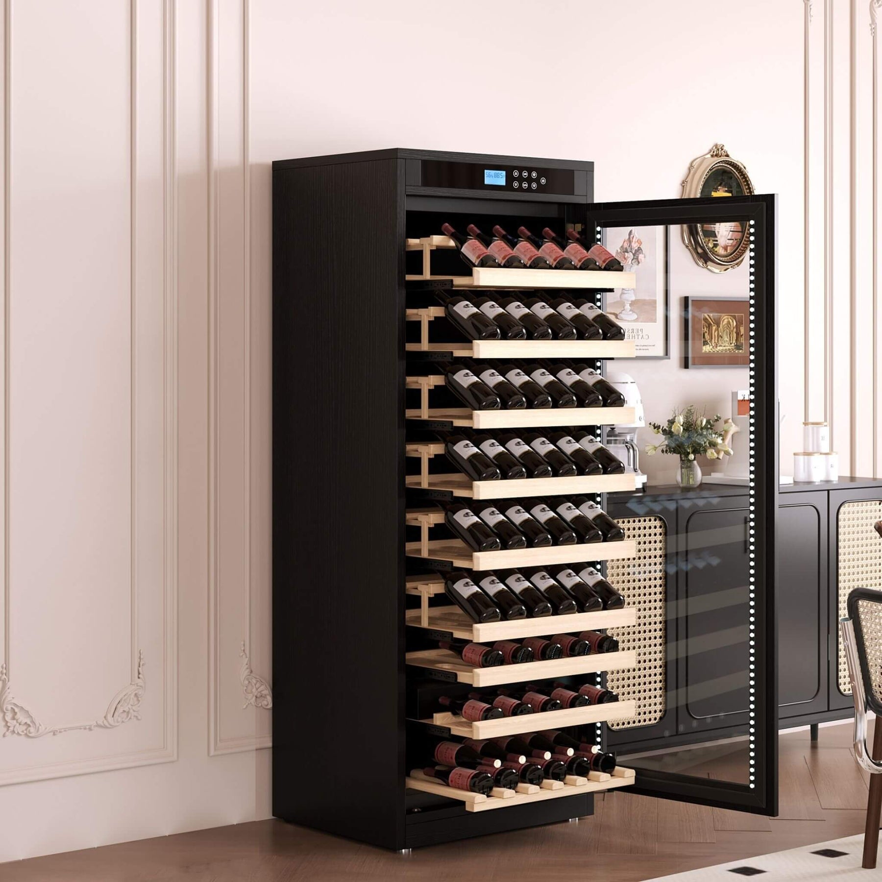 • The luxurious black wood exterior and sleek double-layer tempered glass door create a beautiful showcase for your prized wine collection.