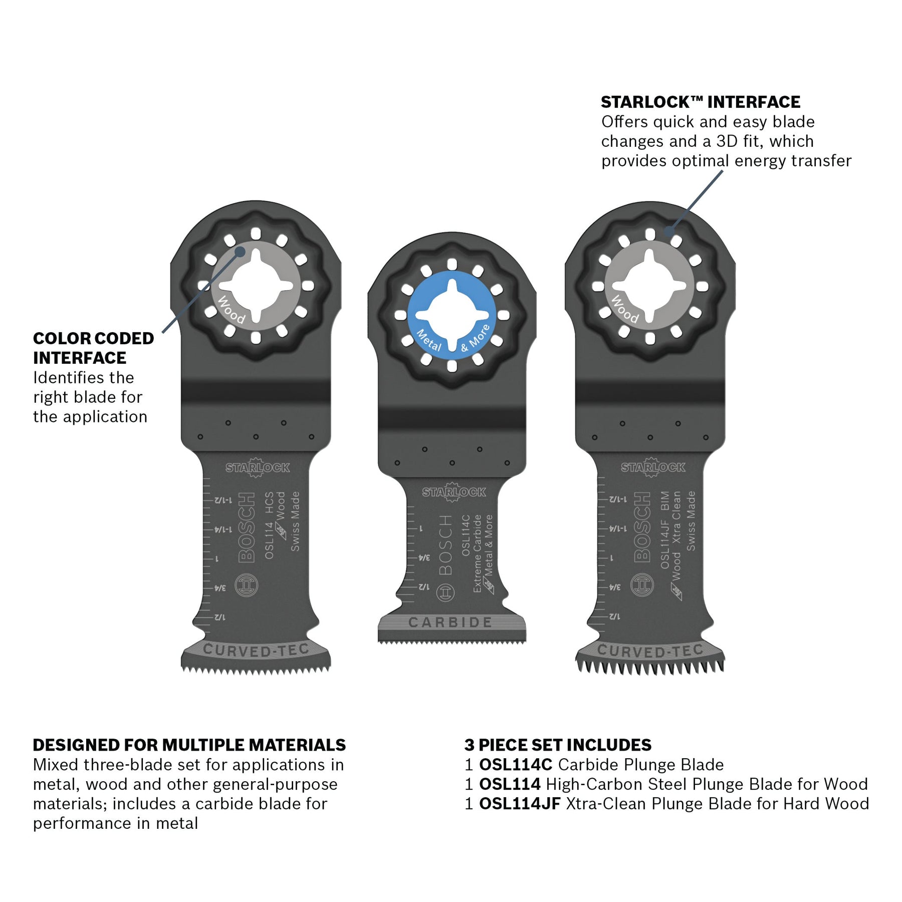 • Includes blades: OSL114C 1-1/4-in. Carbide Plunge Blade; OSL114 1-1/4-in. High-Carbon Steel Plunge Blade for wood; and OSL114JF 1-1/4-in. Xtra Clean Plunge Blade for hard wood.