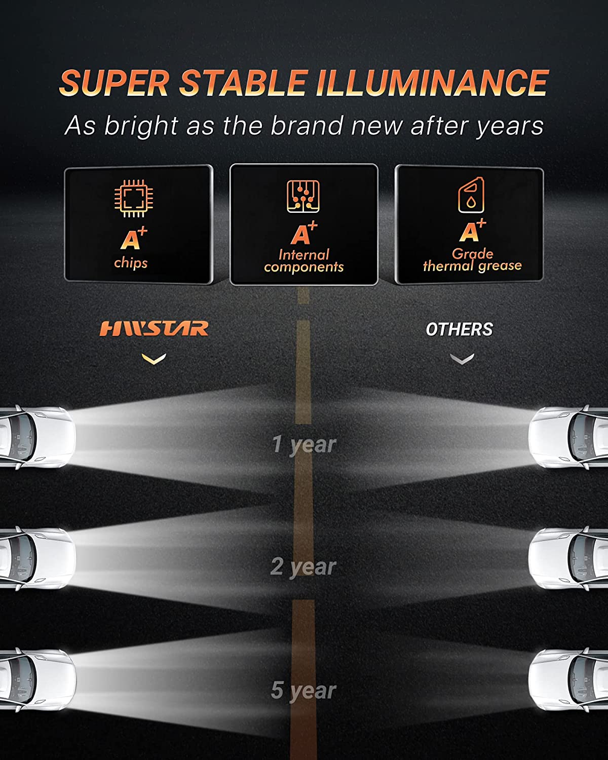 • Quality & Durability: DOT SAE MS-5798 HL Approved; HWSTAR h6054 LED headLight uses high-quality OSRAM chips, unique anti-aging circuit, more effective heat dissipation design, ensures the Lighting does not dim, making it as bright as new after years