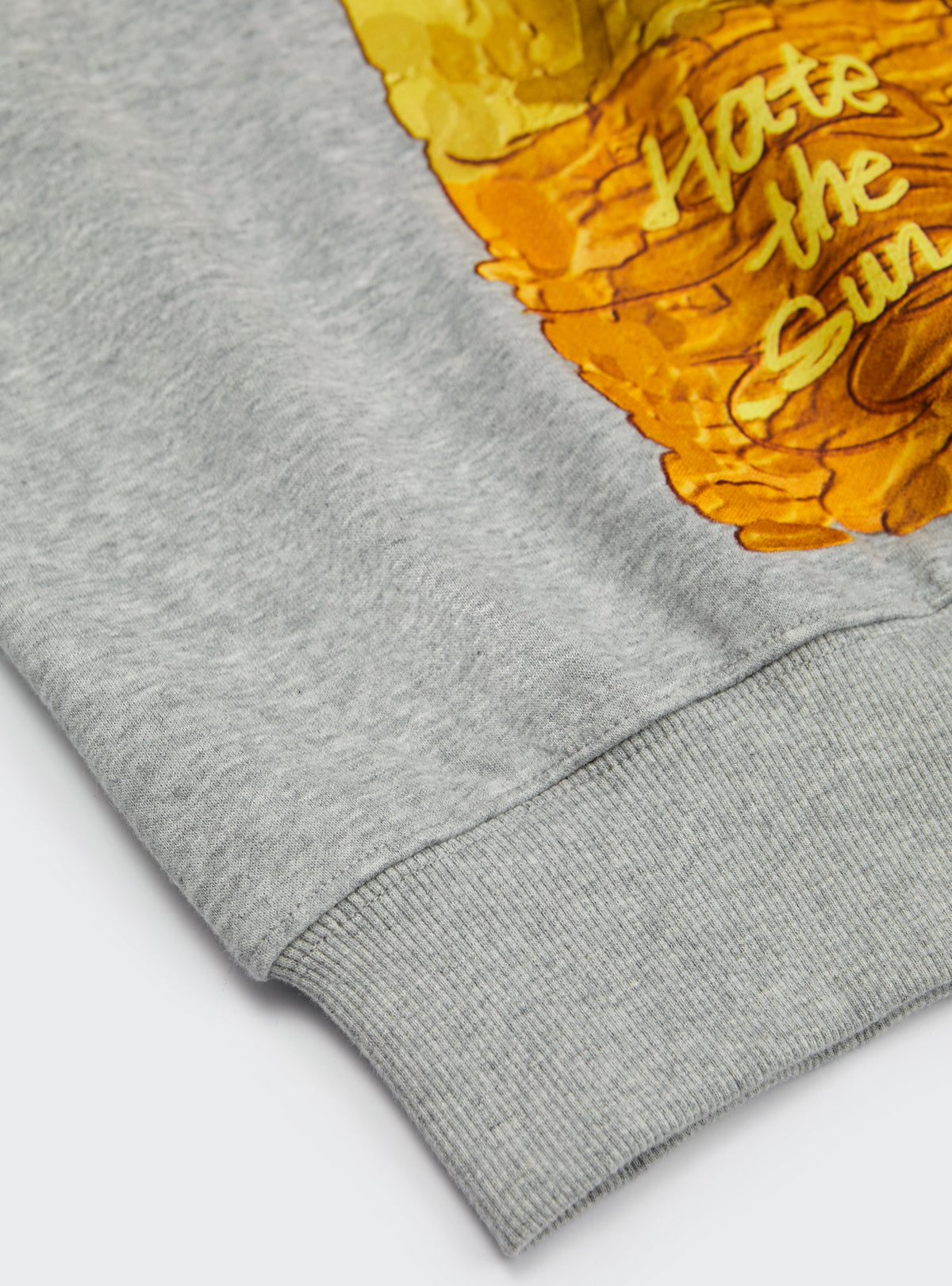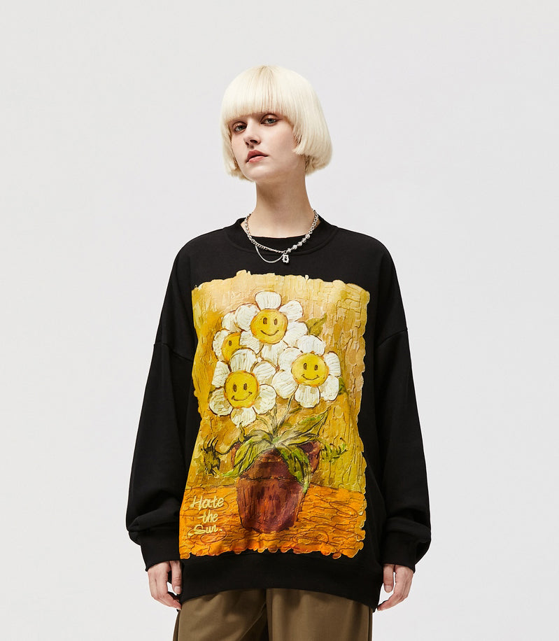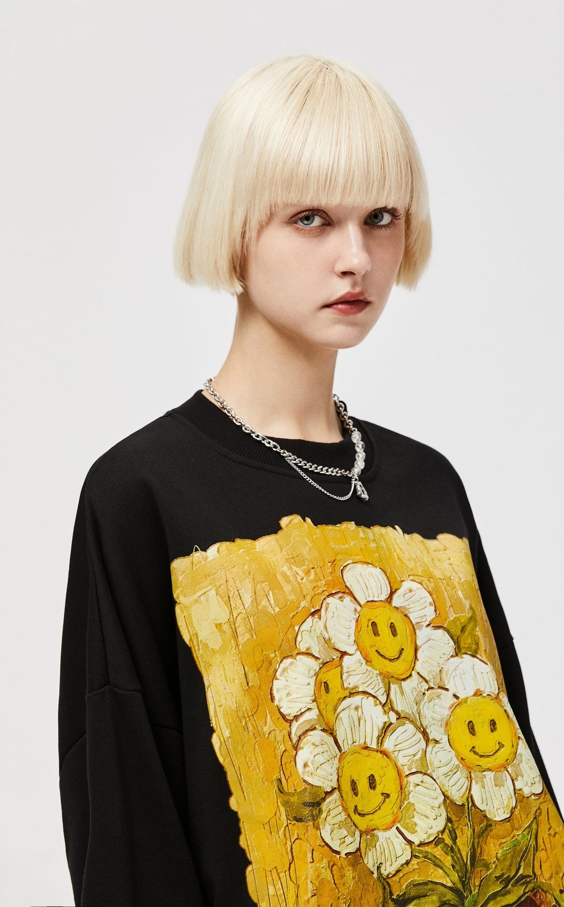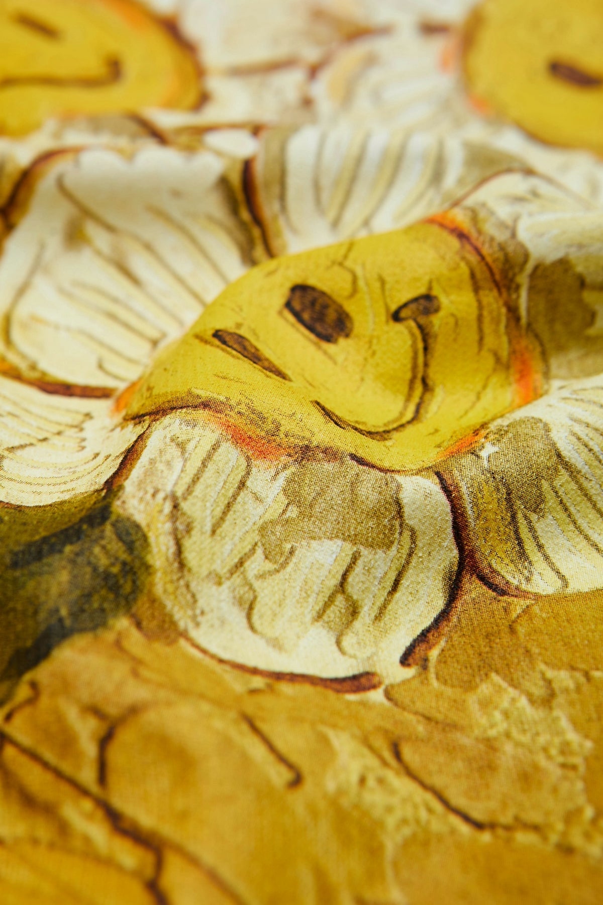 • Full yellow splash artwork of quadruple daisies with smiley faces, giving off urban and streetwear vibes