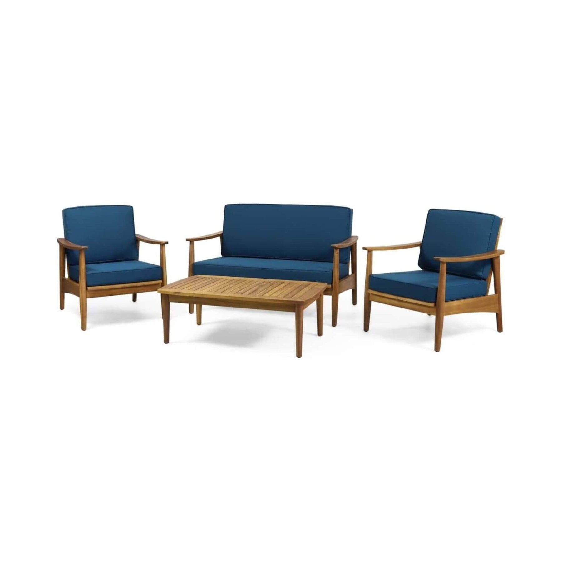 Crafted from durable acacia wood with slatted backrests and seating, this set features tapered legs and a matching coffee table to create a cohesive, timeless look. Plush water-resistant cushions boost comfort and simplify cleanup, so you can spend more time entertaining and less time worrying about spills.