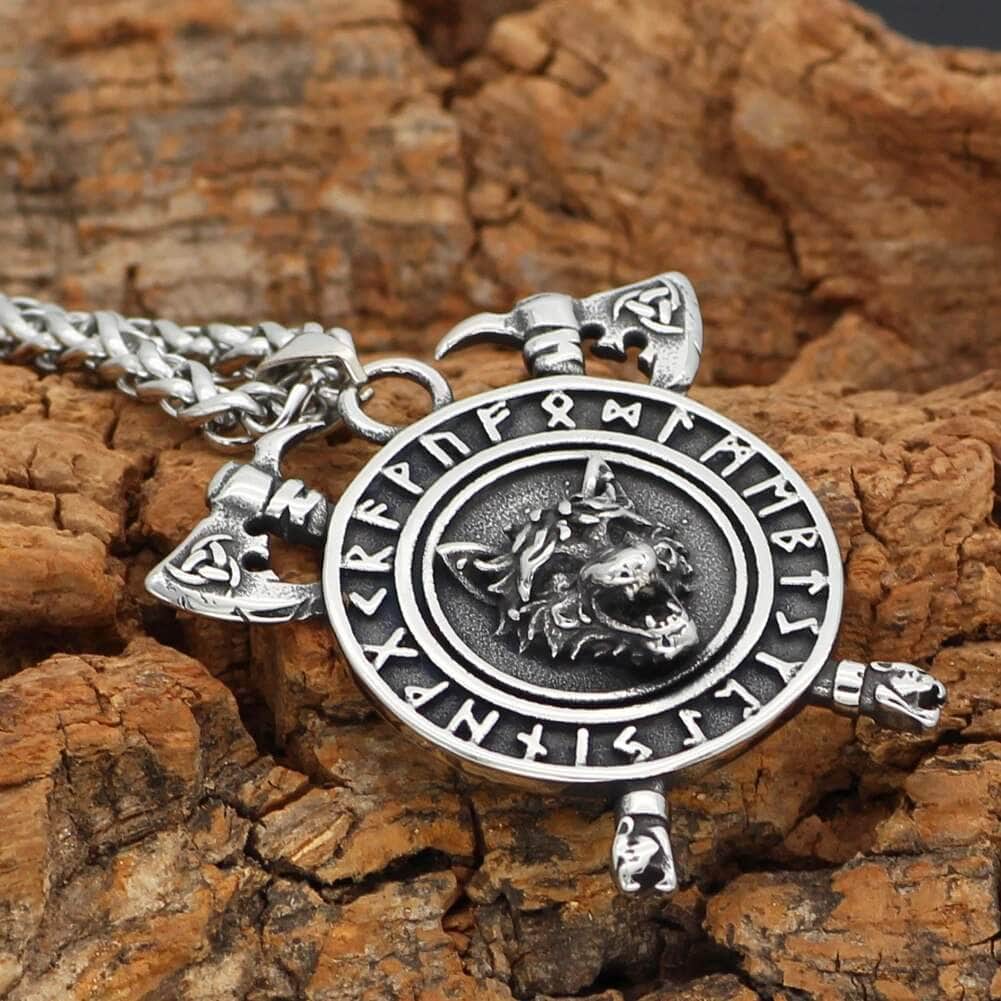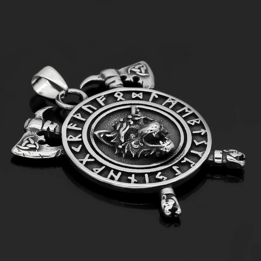 Vikings Wolf Axe and Rune Stainless Steel Necklace