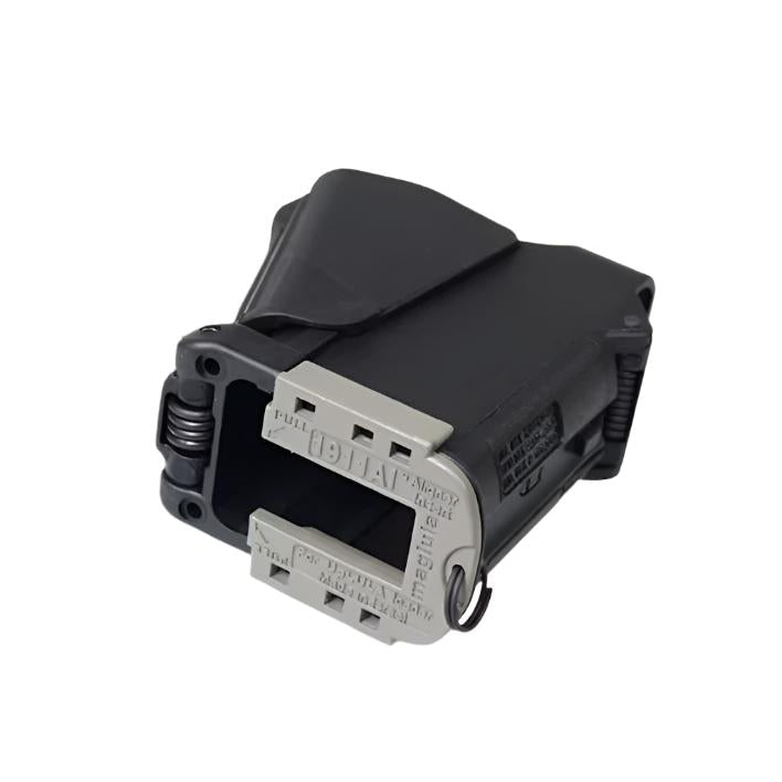 - Connects to the ring of the loader and can be ‘clicked’ to the bottom of the loader to narrow it when using single-stack magazines