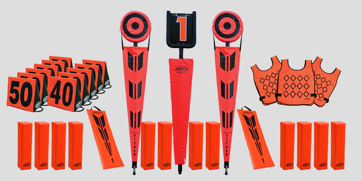 • Includes: Flip Indicator, 7' Chain Set, 11 Sideline Markers, 3 Orange Vests, 3 sets of 4 Deluxe Pylons, and 2 Target Markers.