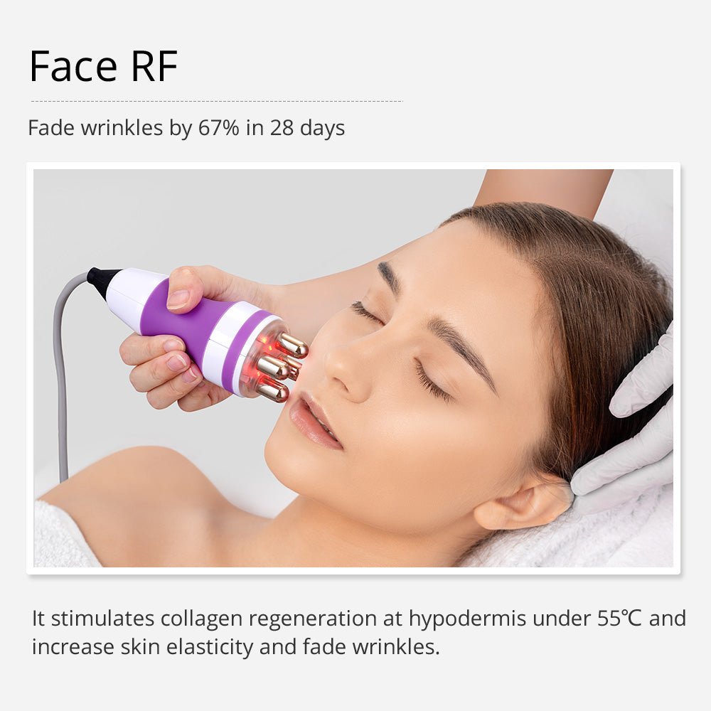 • RF Handles for skin tightening: 4-Polar RF Handle: Frequency: 1MHz • Power: 40W. 3-Polar RF Handle: Frequency: 1MHz • Power: 30W. Designed to boost collagen production for smoother, firmer skin. (Tripolar RF Handle and Sextupolar RF Handle are included in the package.)