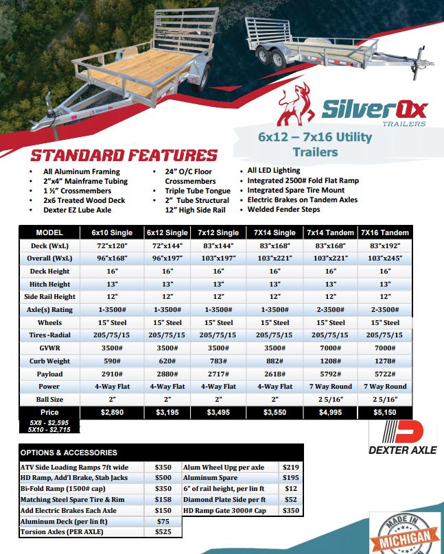 Perfect For: ATVs, landscaping equipment, or heavy loads. With a 5,710 lb capacity and all-aluminum construction, this Silver Ox 7x14 trailer delivers top performance at a compelling price — secure yours now!