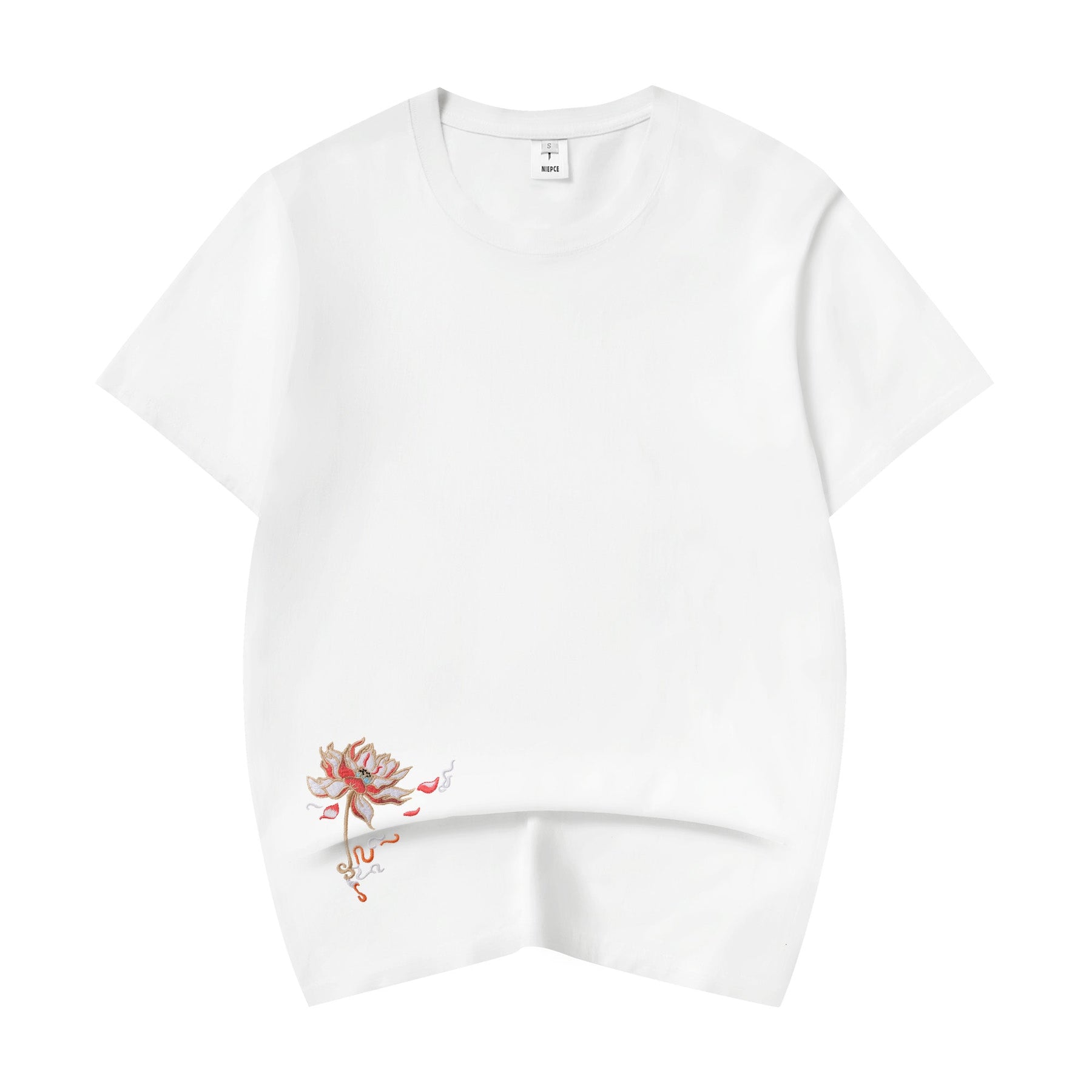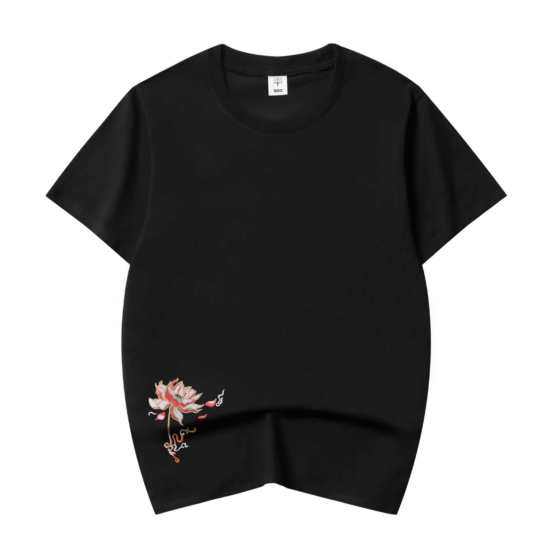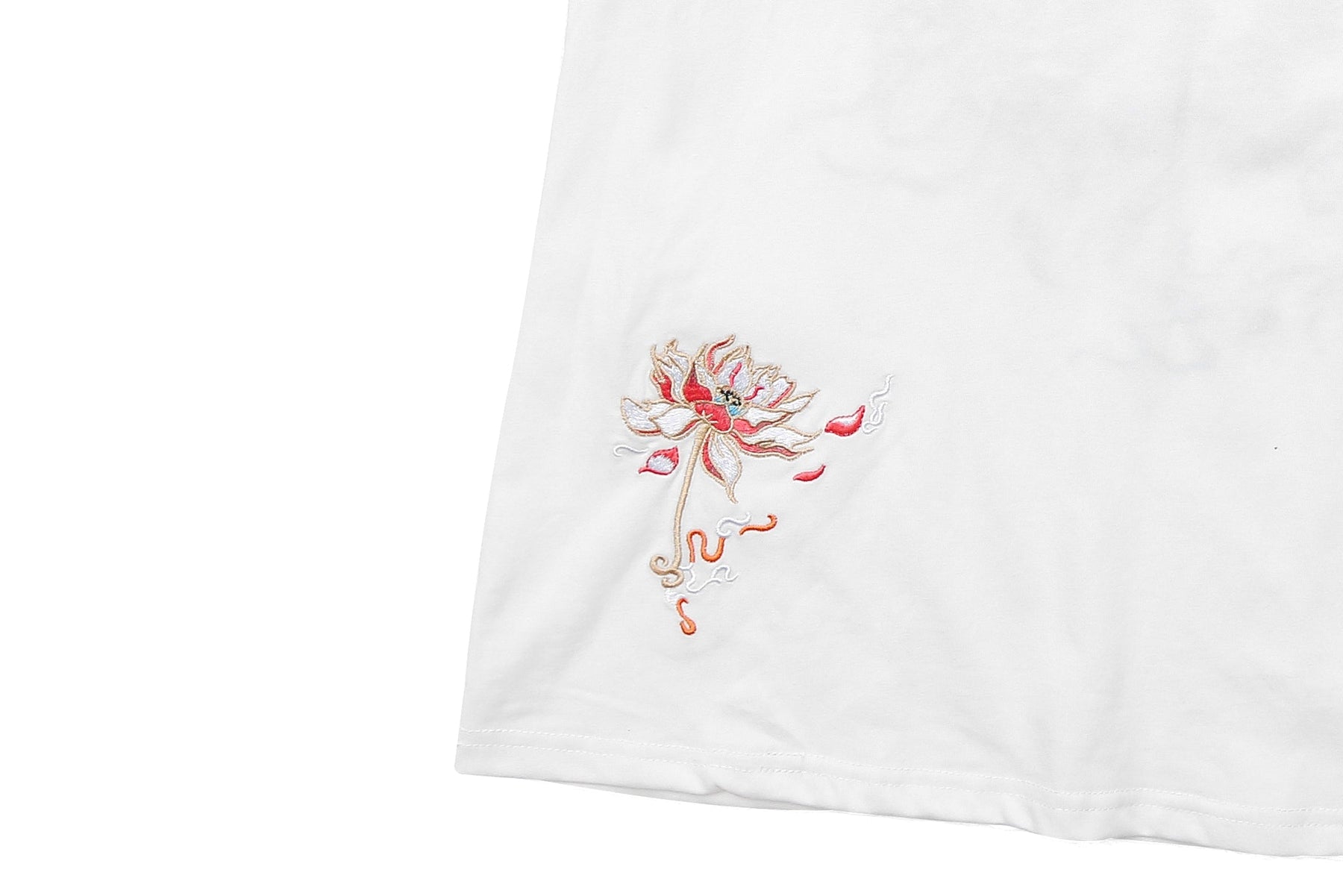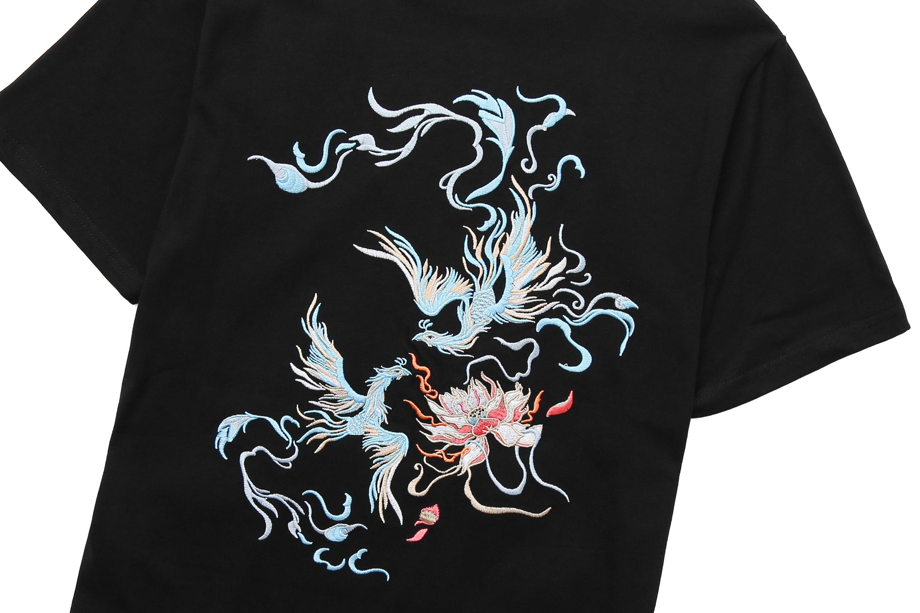 • Duo blue phoenix dancing design with a flower embroidered on the front of the tee.