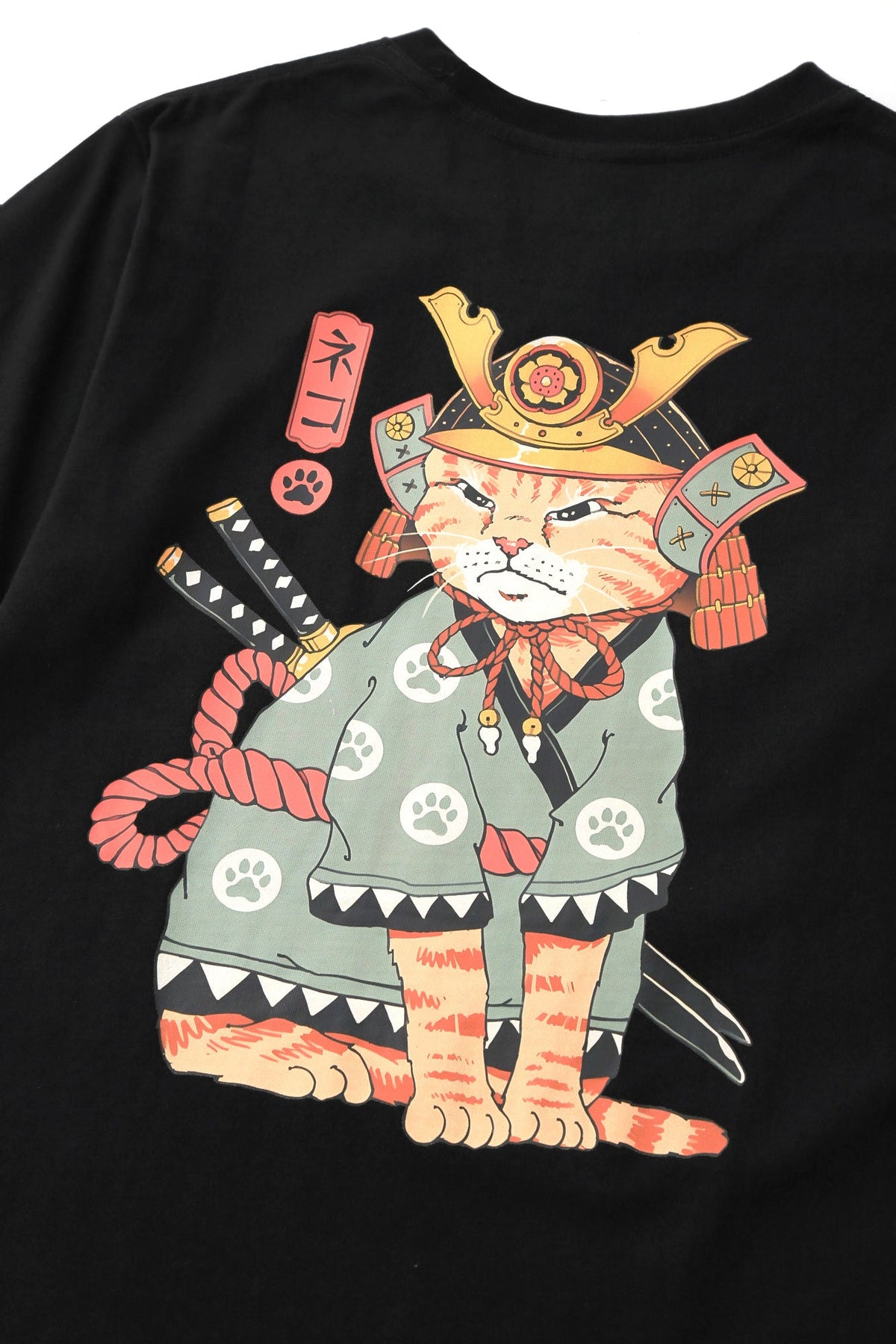 • Design: The short sleeve t-shirt features a samurai cat wearing a Japanese kimono with attached double swords