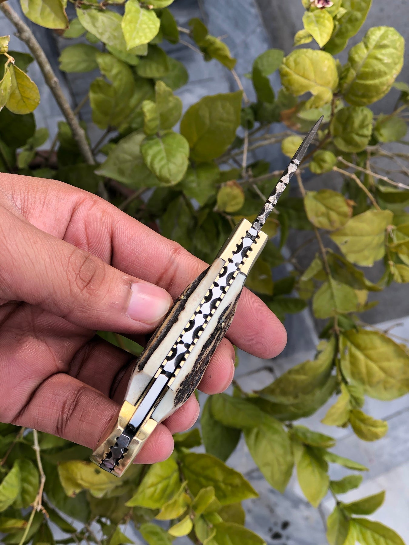 Custom Handmade Damascus Steel Folding Pocket Knife with Antler Horn and Brass Bolsters Handle and Leather Case - For Sale by KBS Knives Store