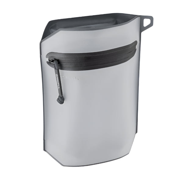 • Wide mouth and water-resistant zippered opening allow one-handed insertion and removal—no second hand required to hold it open.