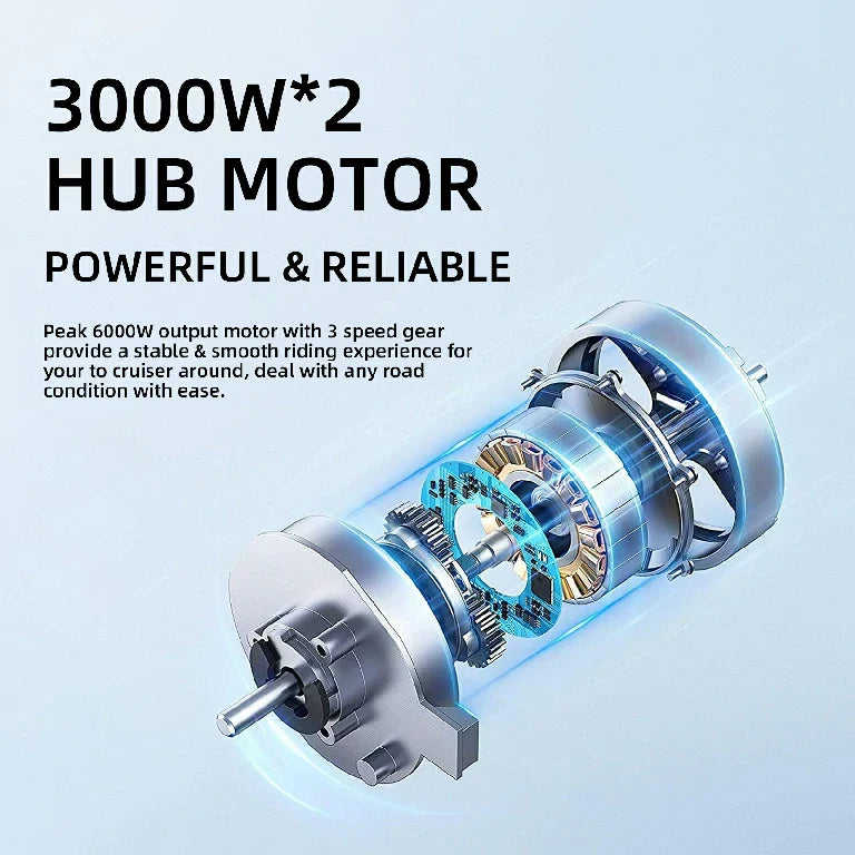 • Powerful dual motors: 2 × 3000W for rapid acceleration and confident hill-climbing power.