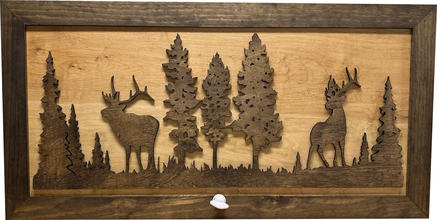 Securely store your firearm and home self defense gear inside the Bellewood Designs Large Hidden Gun Storage Cabinet Wall Decor – Deer and Moose In The Woods Scene. This concealed gun cabinet combines security with style, so your defense tools are easily accessible yet safely tucked away. Its rustic brown frame, natural maple background, and eye-catching 3D deer and moose in the woods scene make it a striking wall centerpiece—until someone looks inside, of course.
