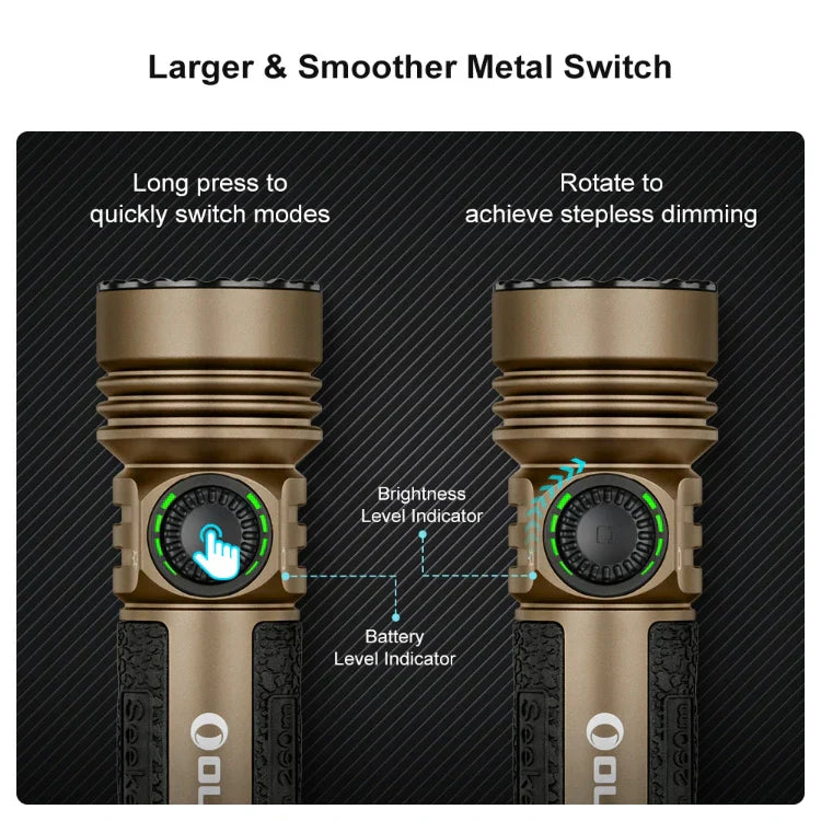 • Larger & smoother metal switch — Long press to switch modes; rotate for step-less dimming to your preferred brightness level, even with heavy gloves.