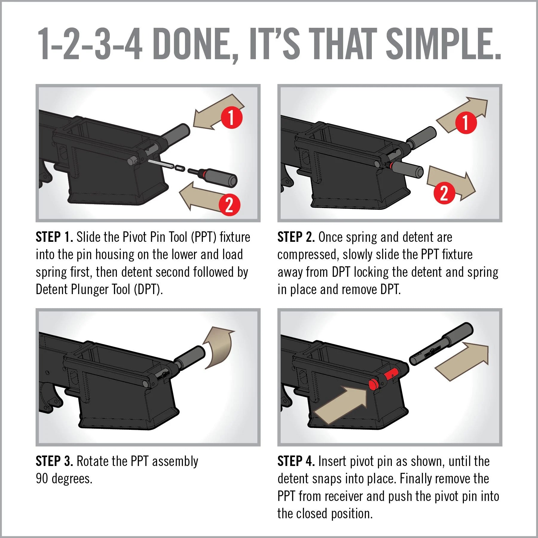 • Speedy setup — 1-2-3-4 done, it’s that simple. Easily install the Pivot Pin Tool for AR10 in less than 60 seconds.
