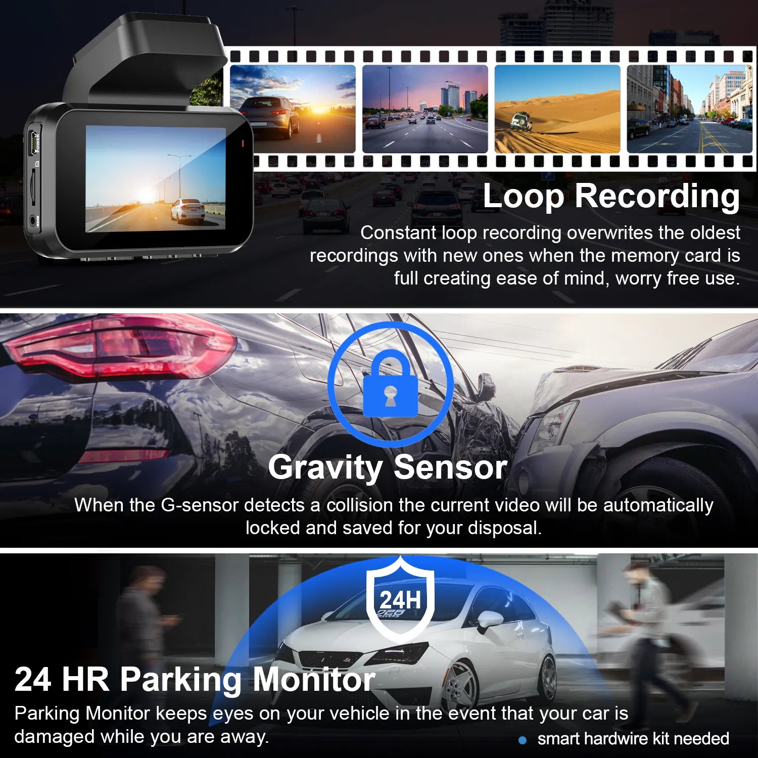 • Parking & Safety: Parking Monitor - Auto Event Detection / Time Lapse; G-Sensor Supported Parking Mode