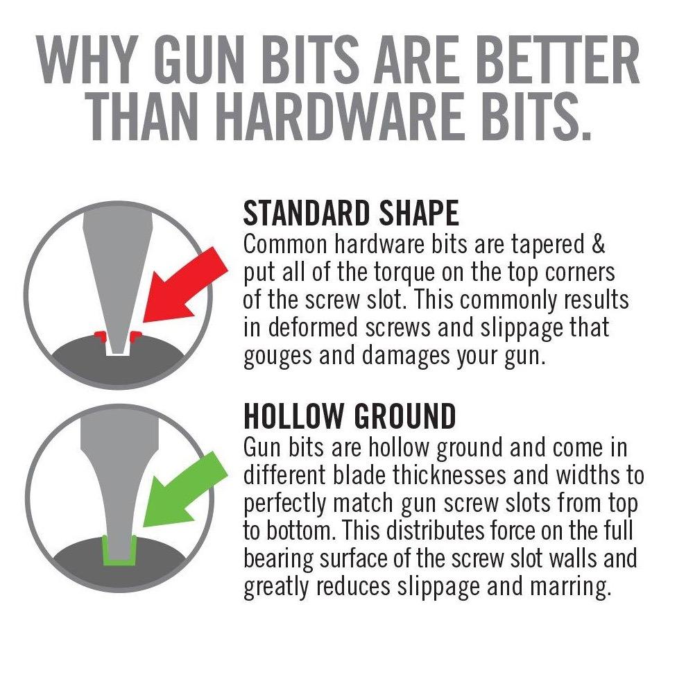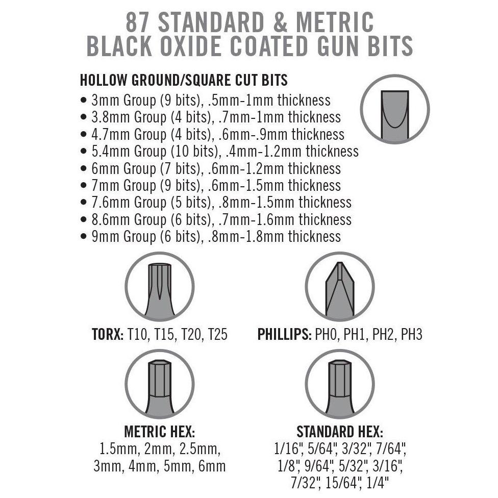 • 87 Standard & Metric Black Oxide Coated Gun Bits — Comprehensive set of premium S2 steel gun bits. Engineered to precisely fit gun hardware. Designed to fail before damaging small, fragile screws and fasteners.