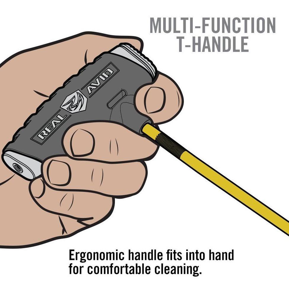 • Rod system: The brass rods have 8-32 connection points and screw together to form a strong and stable 12.5 inch gun cleaning rod. The rods connect to a rotating receiver on the handle. The rotation of the rods prevents them from unscrewing when cleaning the bore. Rods and each implement can also be attached to the fixed position connection point on the handle.