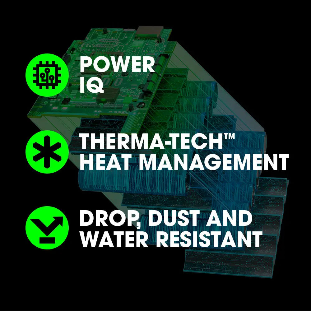 - THERMA-TECH™ HEAT MANAGEMENT Innovative cooling system minimizes heat for 25% longer runtime