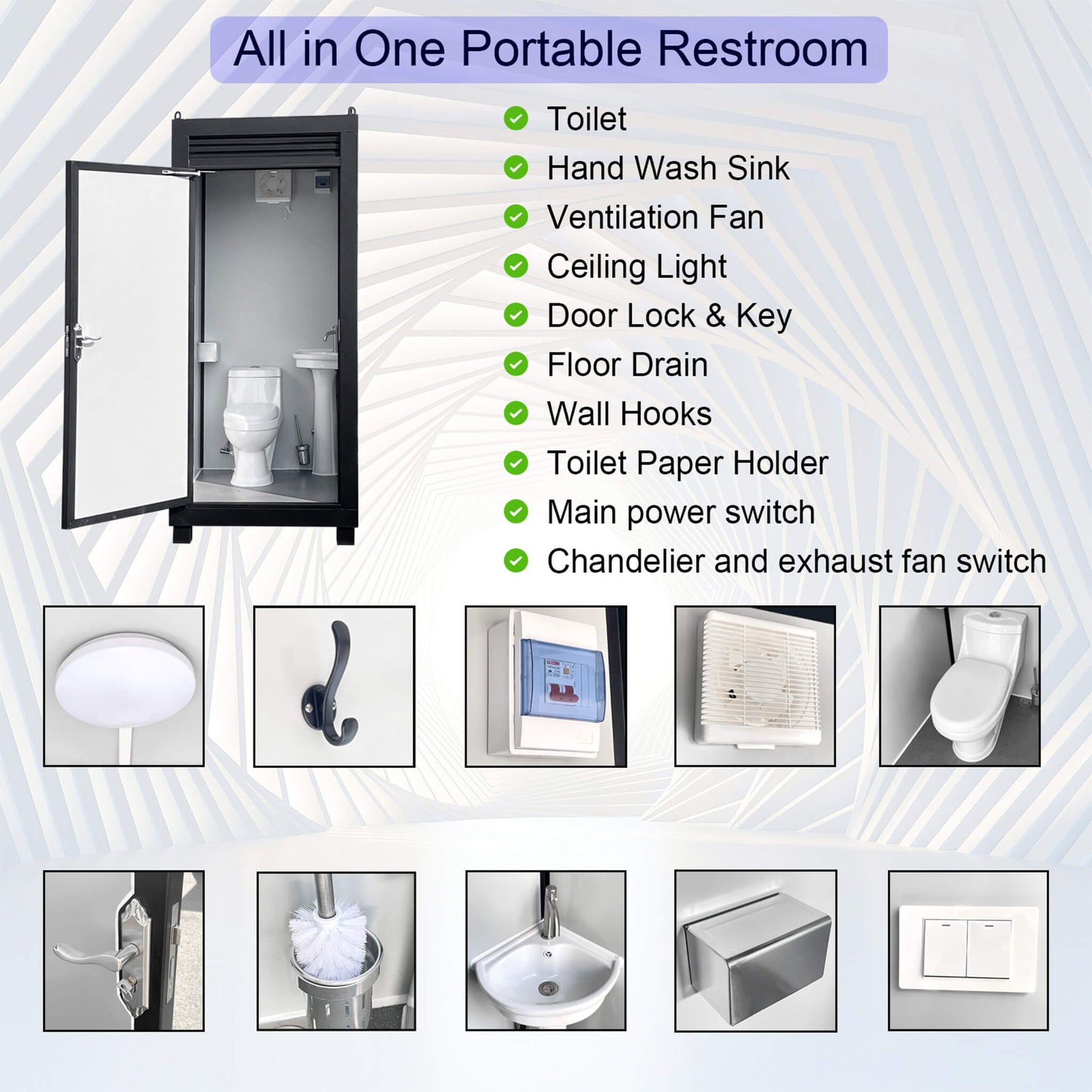 • It is equipped with essential amenities, including a toilet, wash basin, lighting fixture, ventilation fan, exhaust vent, wall hook, and floor drain, making it a complete and functional solution.