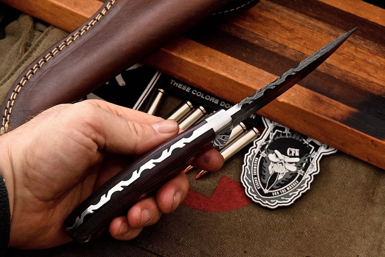 Designed for durability and precision, this knife pairs a razor-sharp Damascus blade with a robust full tang and secure guard, giving you reliability in the field and confidence at the table. The Red Micarta scales provide a confident grip, even in slippery conditions, while the leather belt-loop sheath keeps it securely at your side.