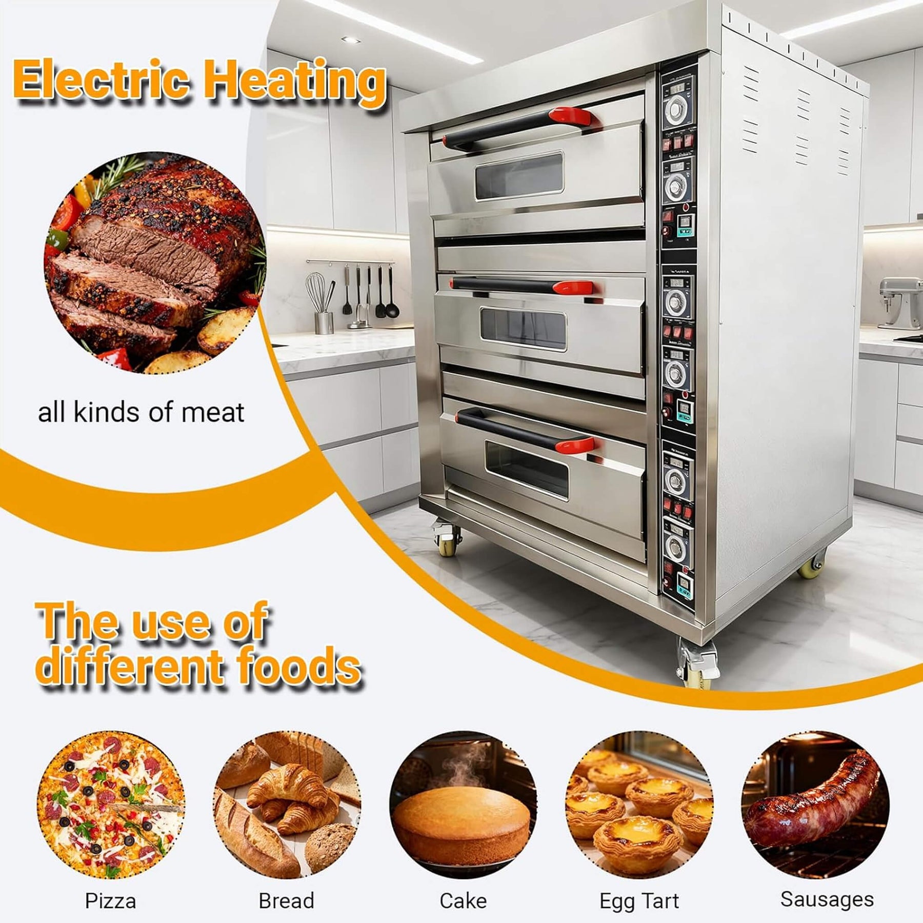 • Versatile functionality allows baking of pizzas, cookies, egg tarts, sausages, and meats to meet diverse culinary needs.