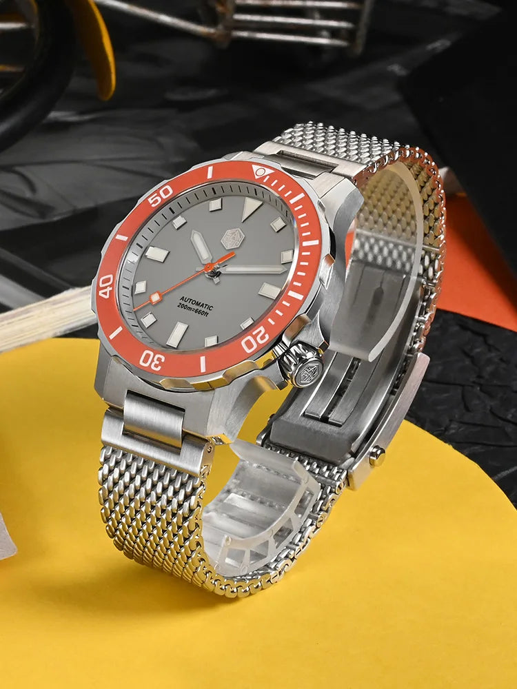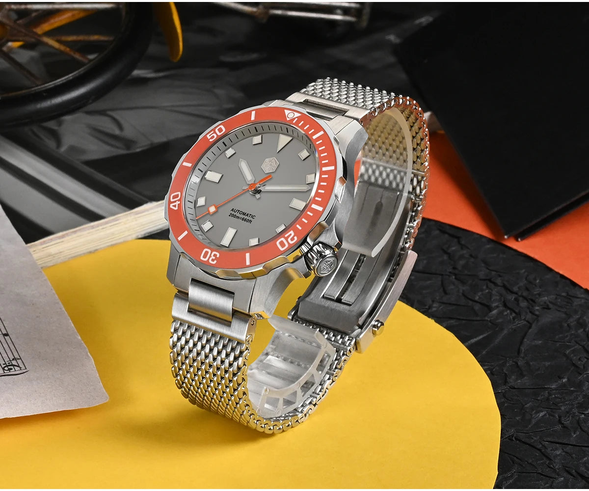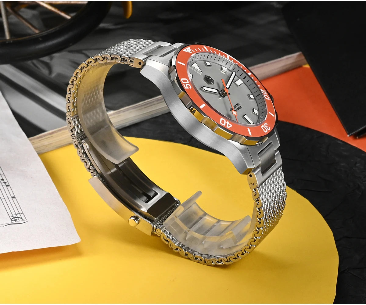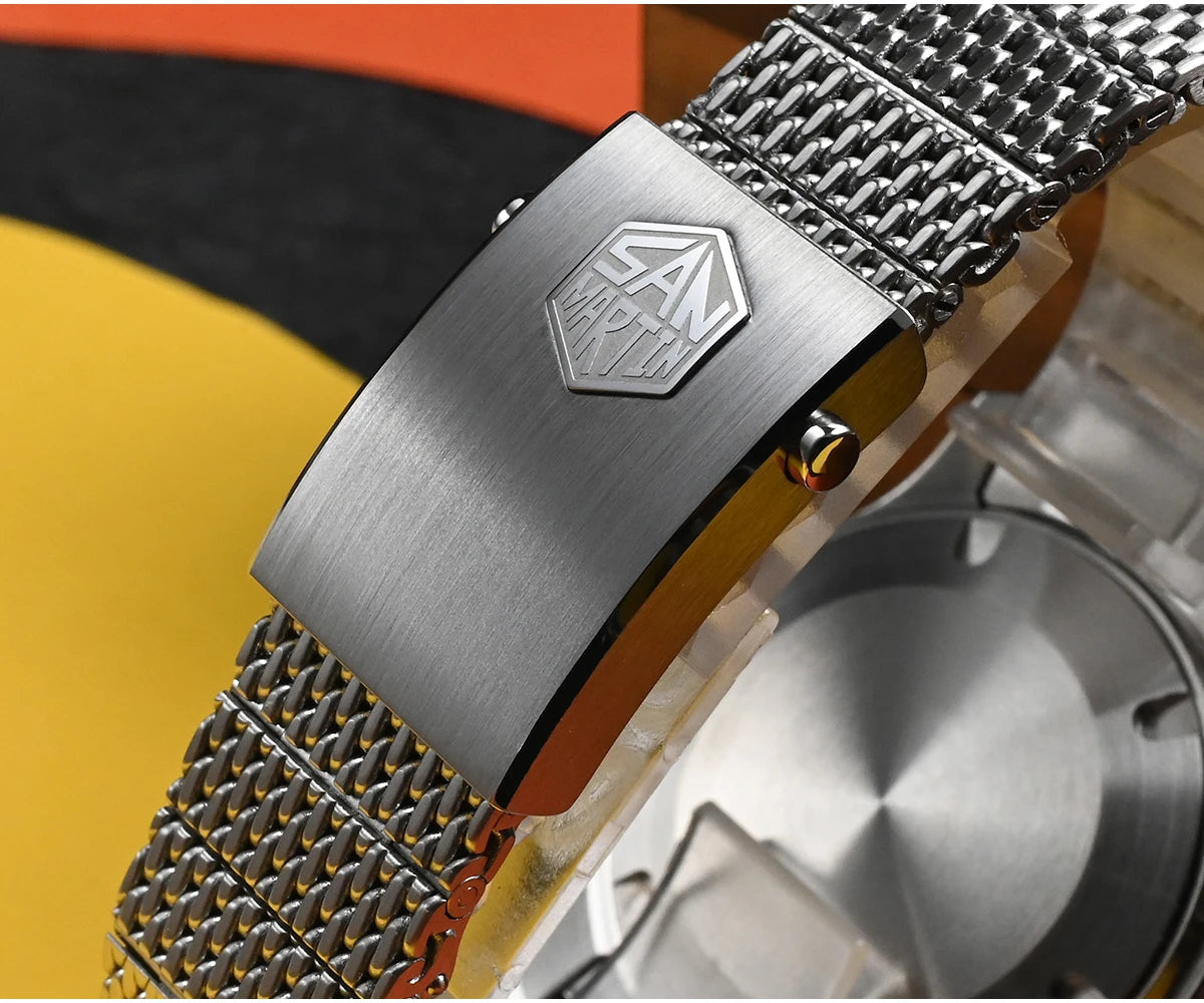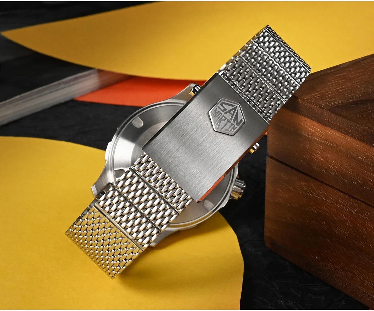 The San Martin Original Design Diver 39.5mm V2 is a rugged automatic diver watch built for serious swimmers and daily explorers alike. With a 200m water rating, a scratch-resistant sapphire crystal, and a sleek Milanese-style stainless steel bracelet, it’s not here to win a runway—it's here to win your confidence in the water and in the boardroom.