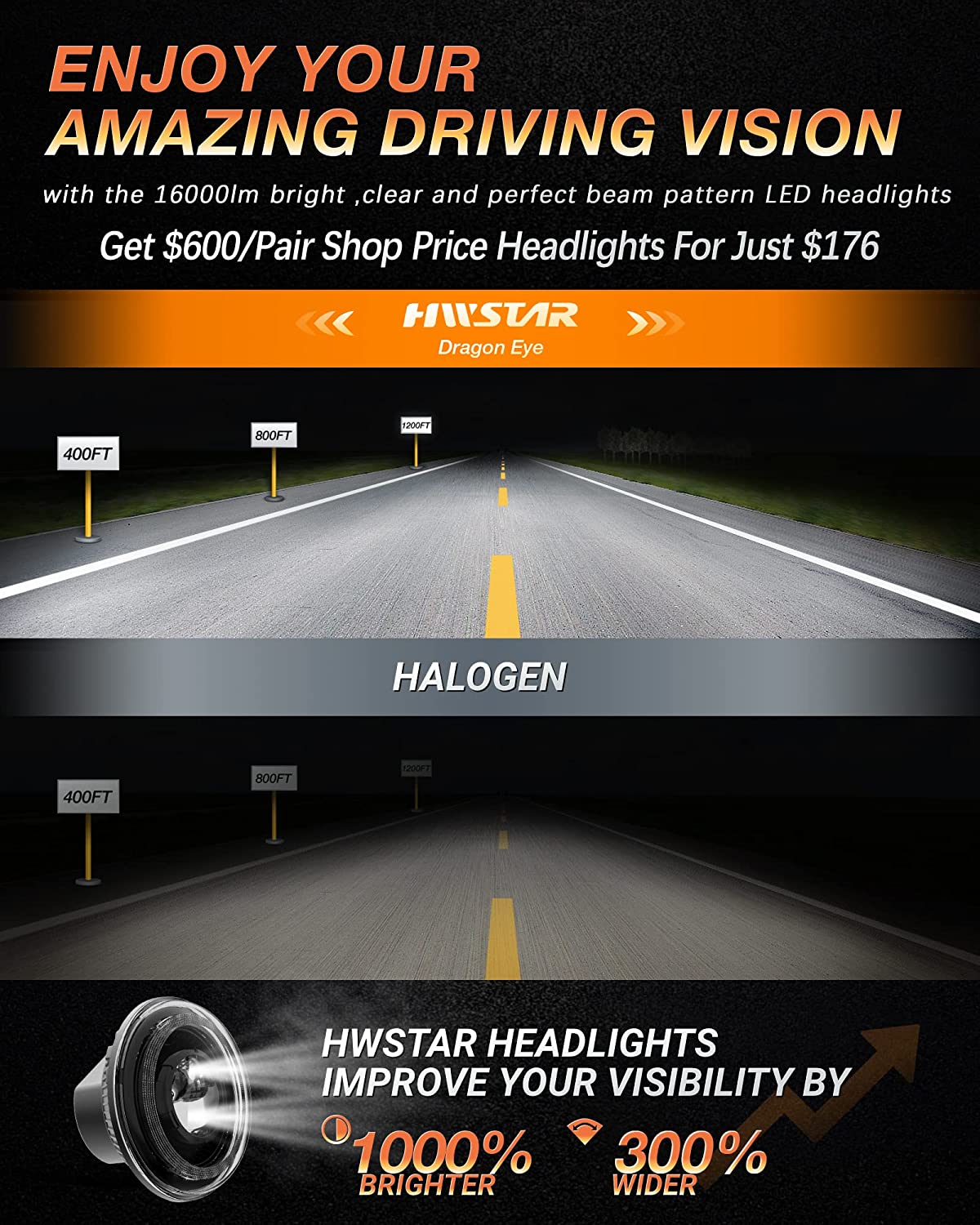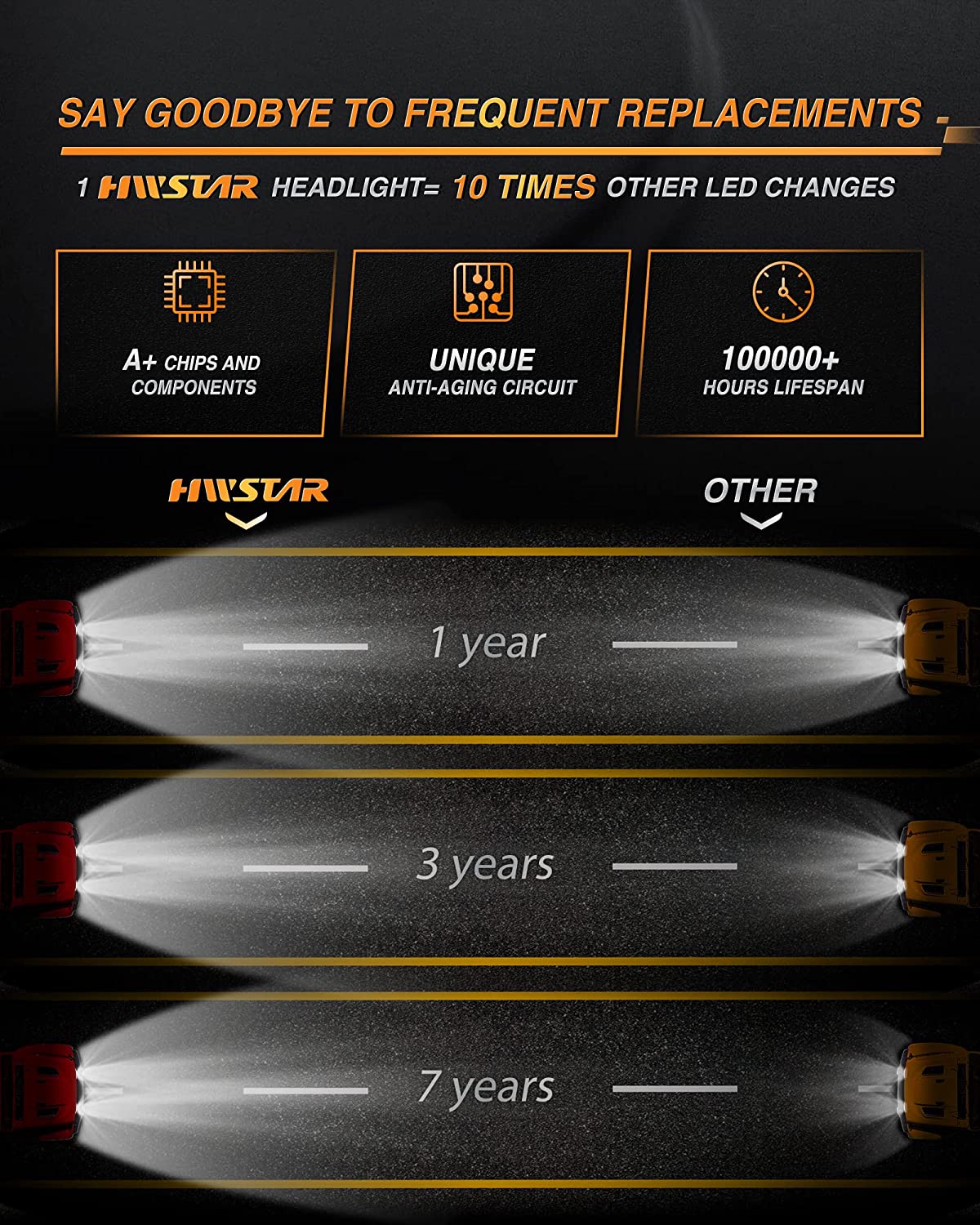 - Stable Lighting — HWSTAR 6014 LED headlights use the high-quality chips, unique anti-aging circuit, more effective heat dissipation design, ensures the lighting does not dim, making it as bright as new after years