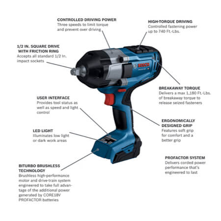 Note: This is a bare tool; batteries and charger are sold separately. For best results, pair with Bosch CORE18V PROFACTOR batteries to unleash the full 740 ft.-lbs of fastening torque and 1,180 ft.-lbs of breakaway power.