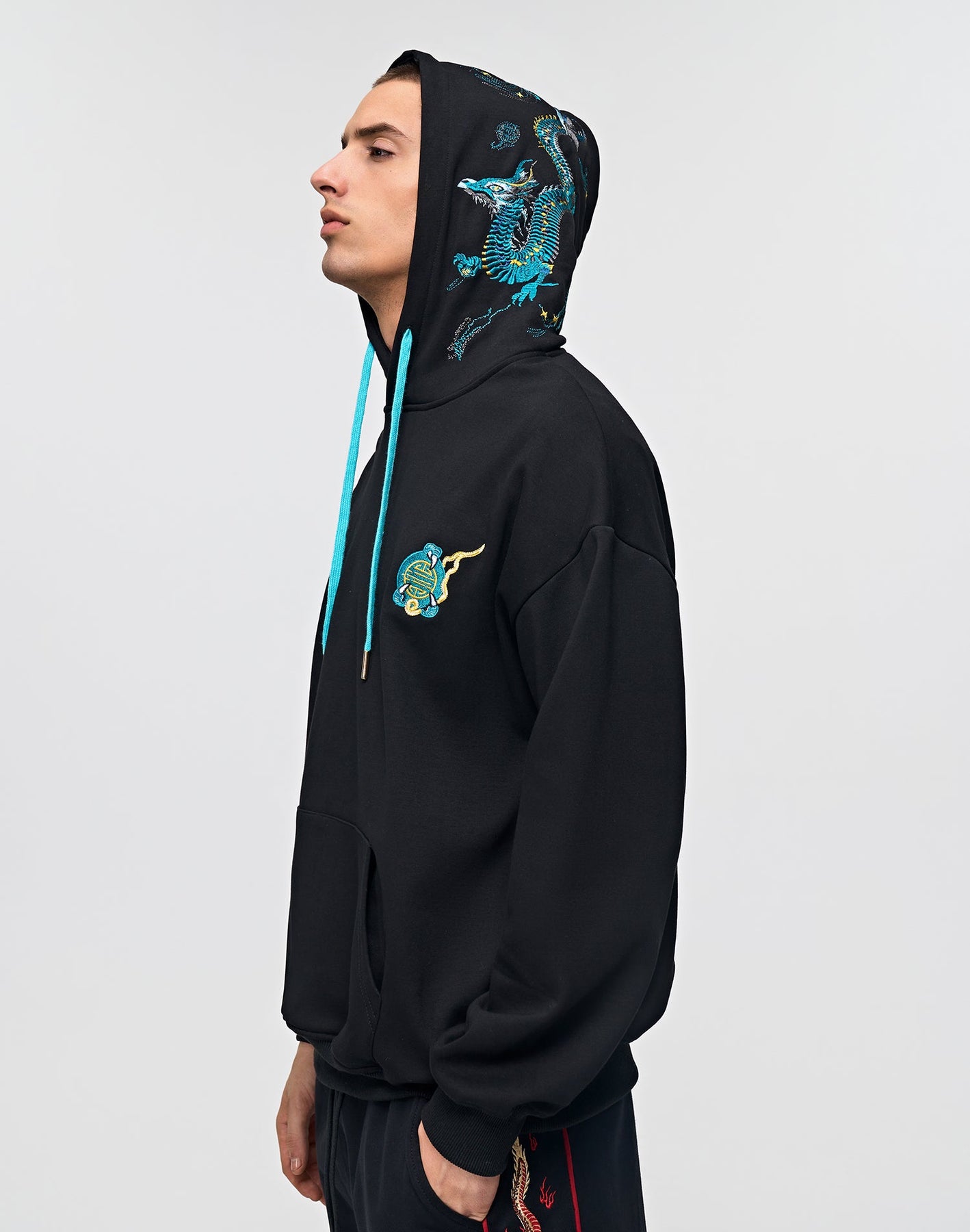 • Embroidery: Blue flying dragon embroidery design on the left side of the hoodie with the dragon's claw holding a medallion on the chest area