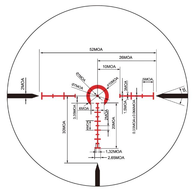 • Zero & Adjustment: Zero Reset turrets with lockable adjustment knobs; precise, tactile elevation and windage, with Total Travel Elevation ≥ 120 MOA (35 Mil) and Total Travel Windage ≥ 120 MOA (35 Mil); Standard Click Value 1/2 MOA.