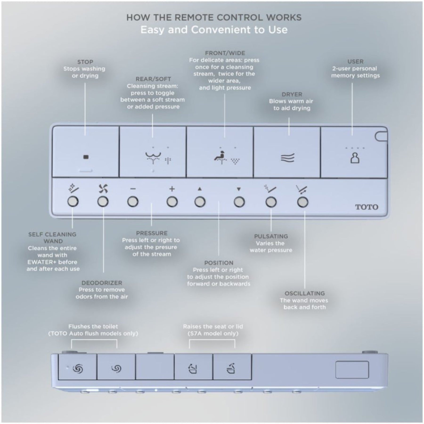 • Washlet S7A Auto Bidet Seat & EWATER+ Technology: A warm, self-cleansing bidet seat, controlled by a user-friendly remote; EWATER+ technology keeps your toilet bowl cleaner with a refreshing mist, reducing the need for harsh chemicals.