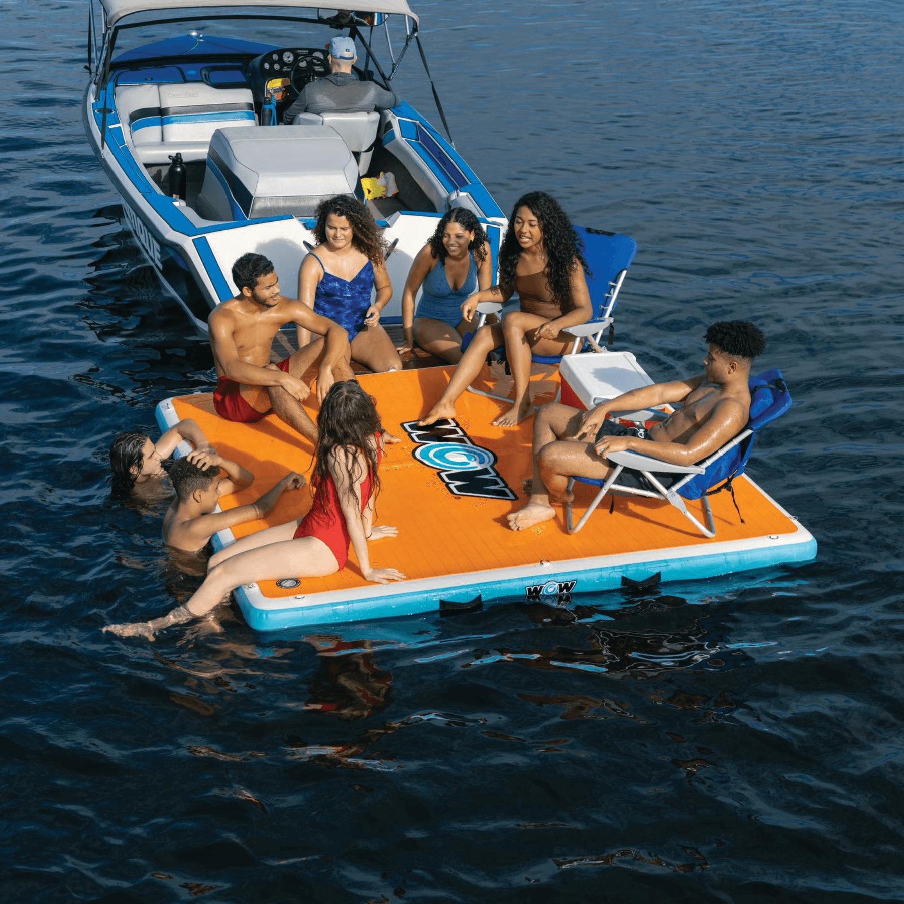 WOW Watersports Drop Stitch Vacation Station Dock is an 8' x 8' inflatable floating dock with 6" thickness, designed for lakes, boats, and days when you want a stable surface to lounge, play, or chill out with friends. Built with drop stitch technology, it distributes air to create a sturdy surface you can depend on—even when the water is less cooperative.