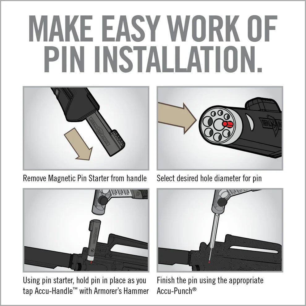 • Stored in the handle is a removable, stainless steel, magnetic pin starter to provide a helping hand when building or modifying firearms.