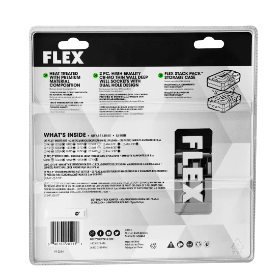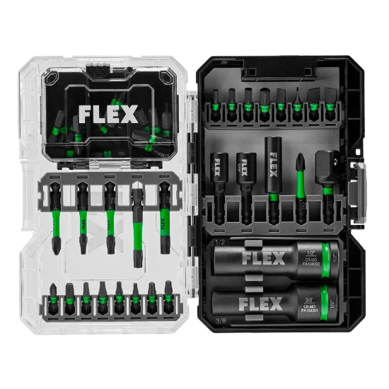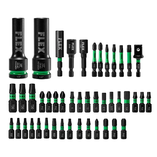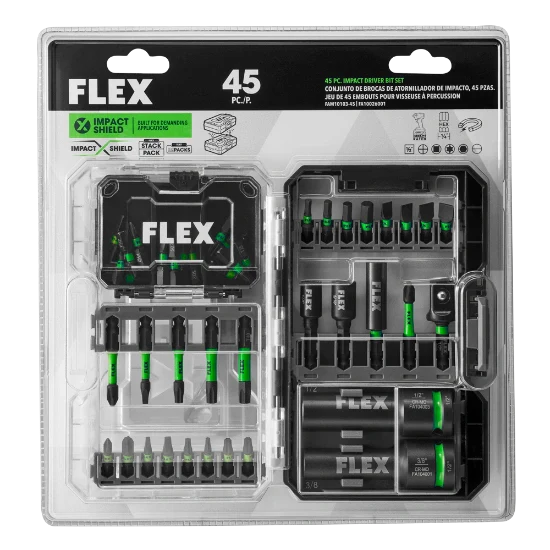 FLEX FAM10103-45 Impacks 45-Piece Impact Driver Bit Set powers through demanding applications with precision, durability, and control in every bit. This 45-piece kit includes a mix of Allen and Slotted bits not found in most impact sets, all optimized for long bit life and maximum energy transfer.